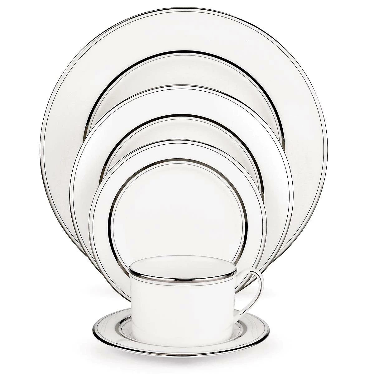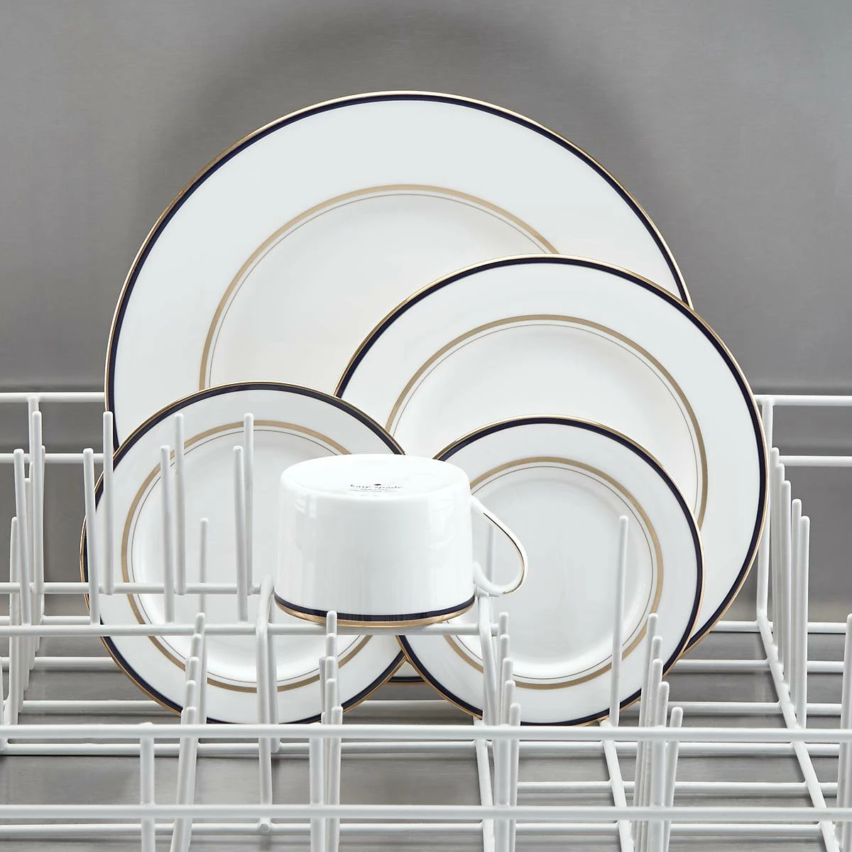 Bands of navy and platinum lend the Library Lane Navy Collection a sophisticated look. From Kate Spade New York, this 5-piece place setting is crafted of durable white bone china with precious platinum accents, and is dishwasher-safe.