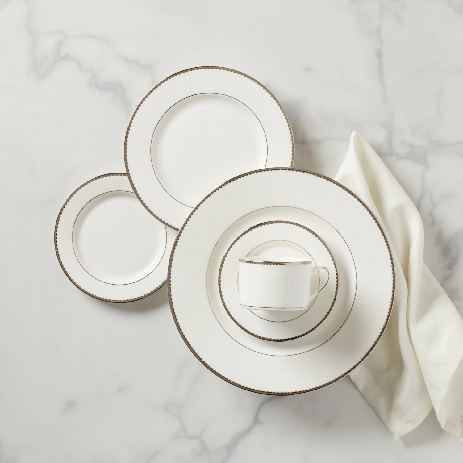 Because every meal — whether it is a multi-course homemade masterpiece or Chinese takeout and cupcakes — deserves a perfectly pretty place setting. Like this 5-piece place setting from the Sugar Pointe Collection, crafted of dishwasher-safe, durable white bone china with precious platinum accents. Bon appetit!
