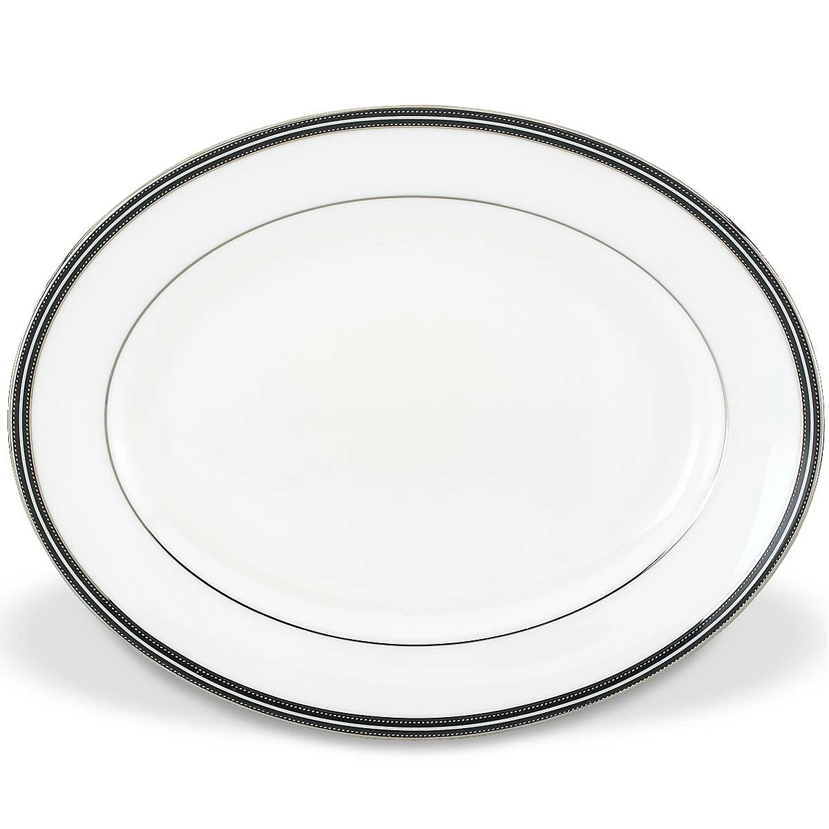 White raised “stitches” with black banding and platinum details give the kate spade new york Union Street 13″ Oval Platter a sophisticated look. This is chic bone china dinnerware, perfect for any occasion.