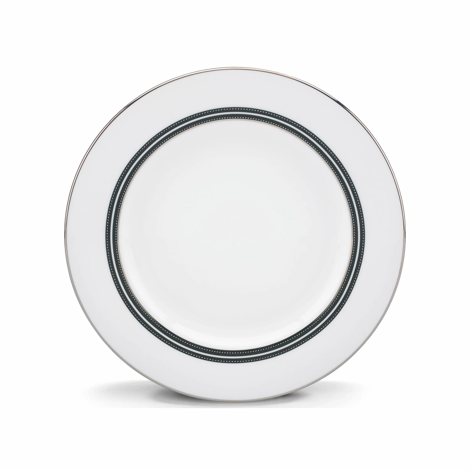 White raised “stitches” with black banding and platinum details give the kate spade new york Union Street Salad Plate a sophisticated look. This is chic bone china dinnerware, perfect for any occasion.
