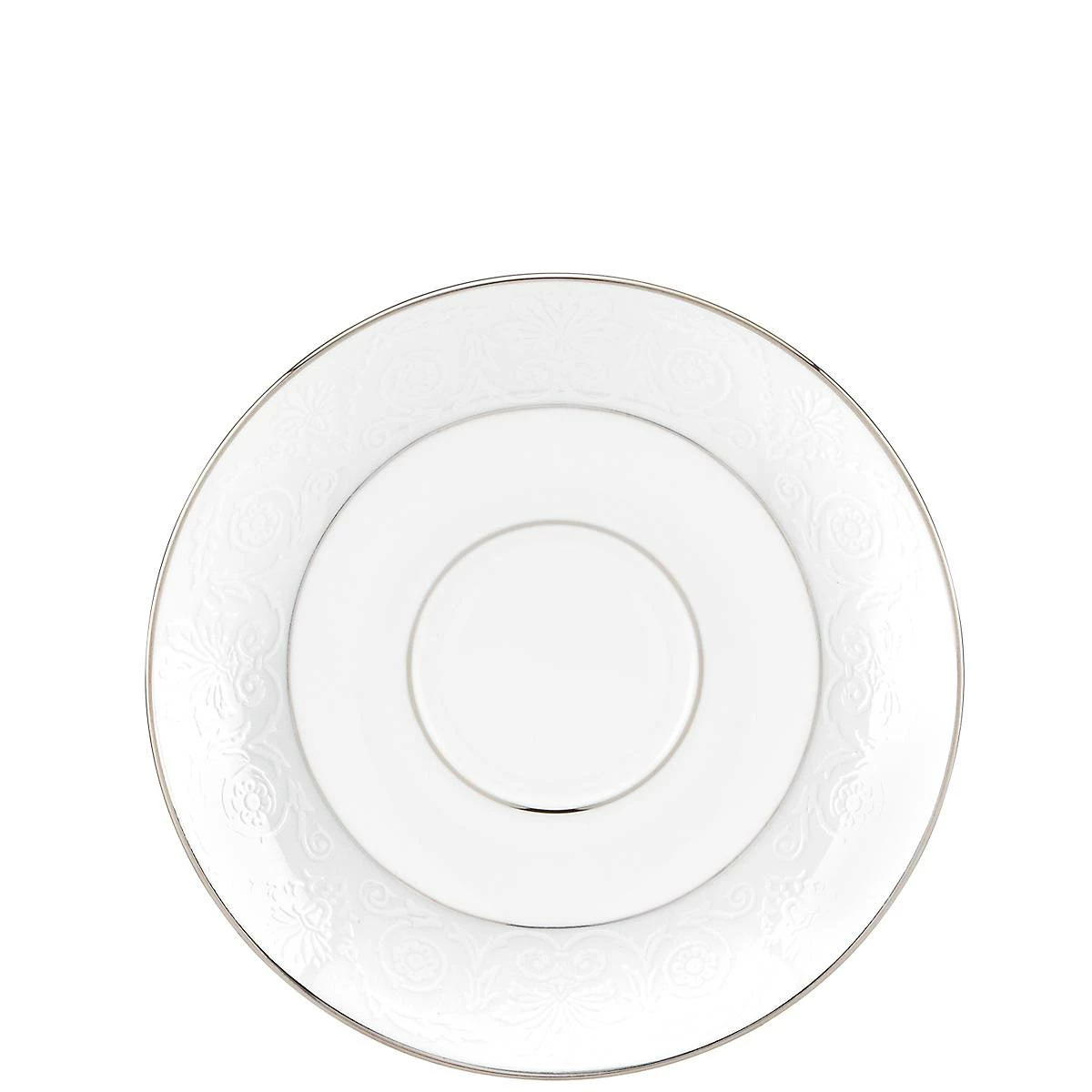 This durable white bone china saucer features a raised floral scroll design inside three concentric circles of precious platinum accenting. The Artemis Saucer is the epitome of elegant dinnerware.