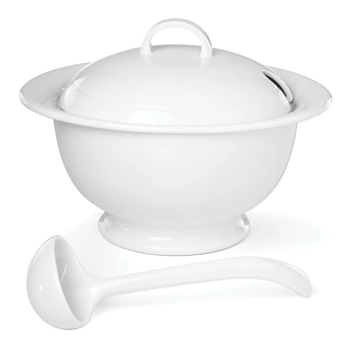 The Aspen Ridge 3-piece Party Bowl Set features a smooth and faultless motif. This durable white ceramic porcelain set features a bowl, lid, and ladle, and is ideal for serving soups and stews.