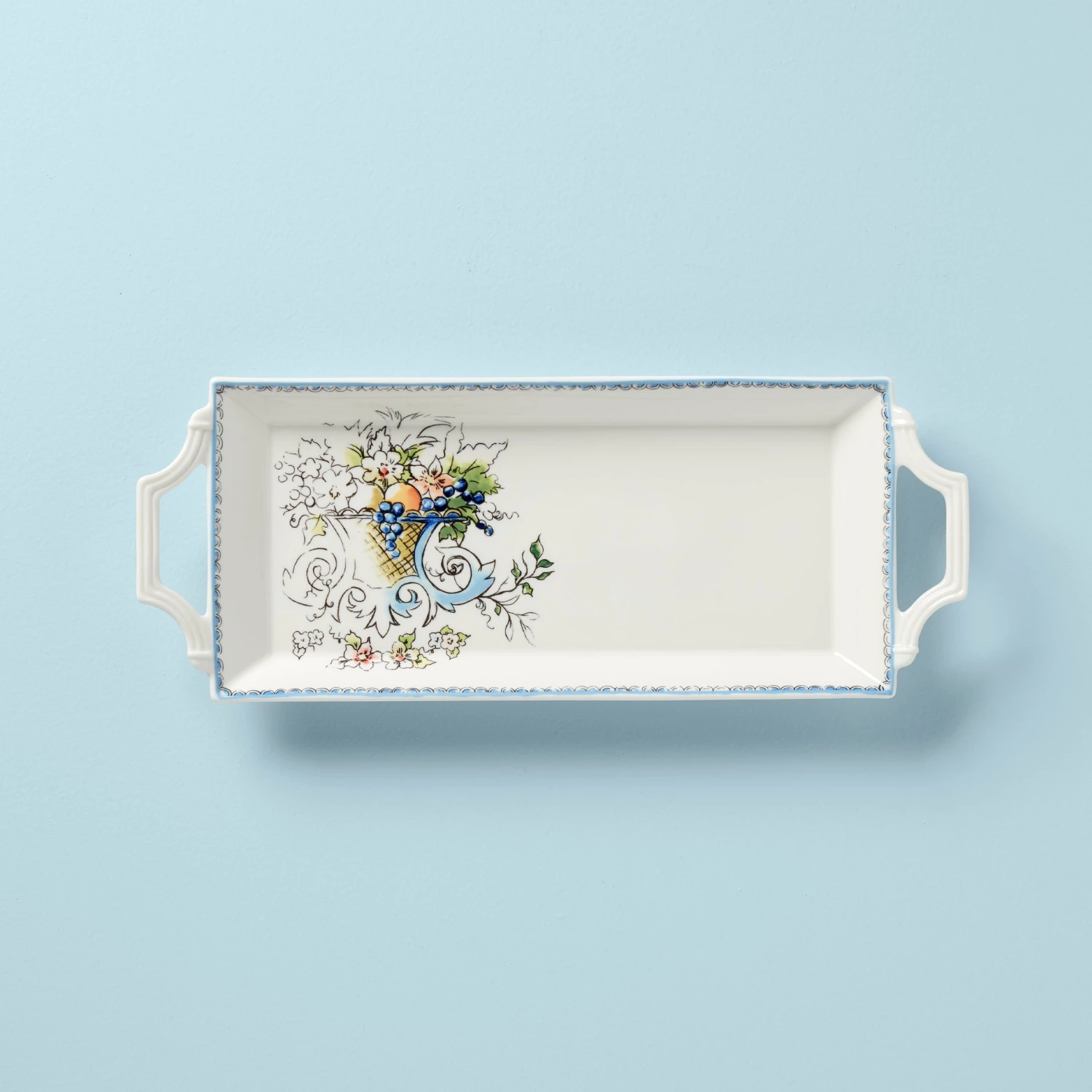 Dish out homemade appetizers and desserts on this chic serving tray—or just keep it as a decorative piece on your mantel! The beveled design is accented with an artistic update of our 1918 Autumn pattern featuring lush watercolors and a masterpiece-in-the-making sketchbook effect. Autumn Studio is a love letter to our legendary collection; featuring the same cornucopia motif now on durable white porcelain that is both dishwasher and microwave safe. We added ornate, double-lined handles for easy serving and stylish presentation.