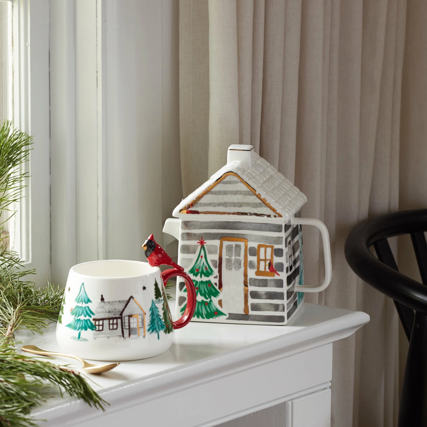 New to the Balsam Lane collection is this decorative teapot shaped like a cozy cabin and featuring a beautiful pattern of a Christmas tree and a perched cardinal. Crafted of porcelain and topped with 24k gold accents, it’s perfect for serving a warm cup of tea in the winter!