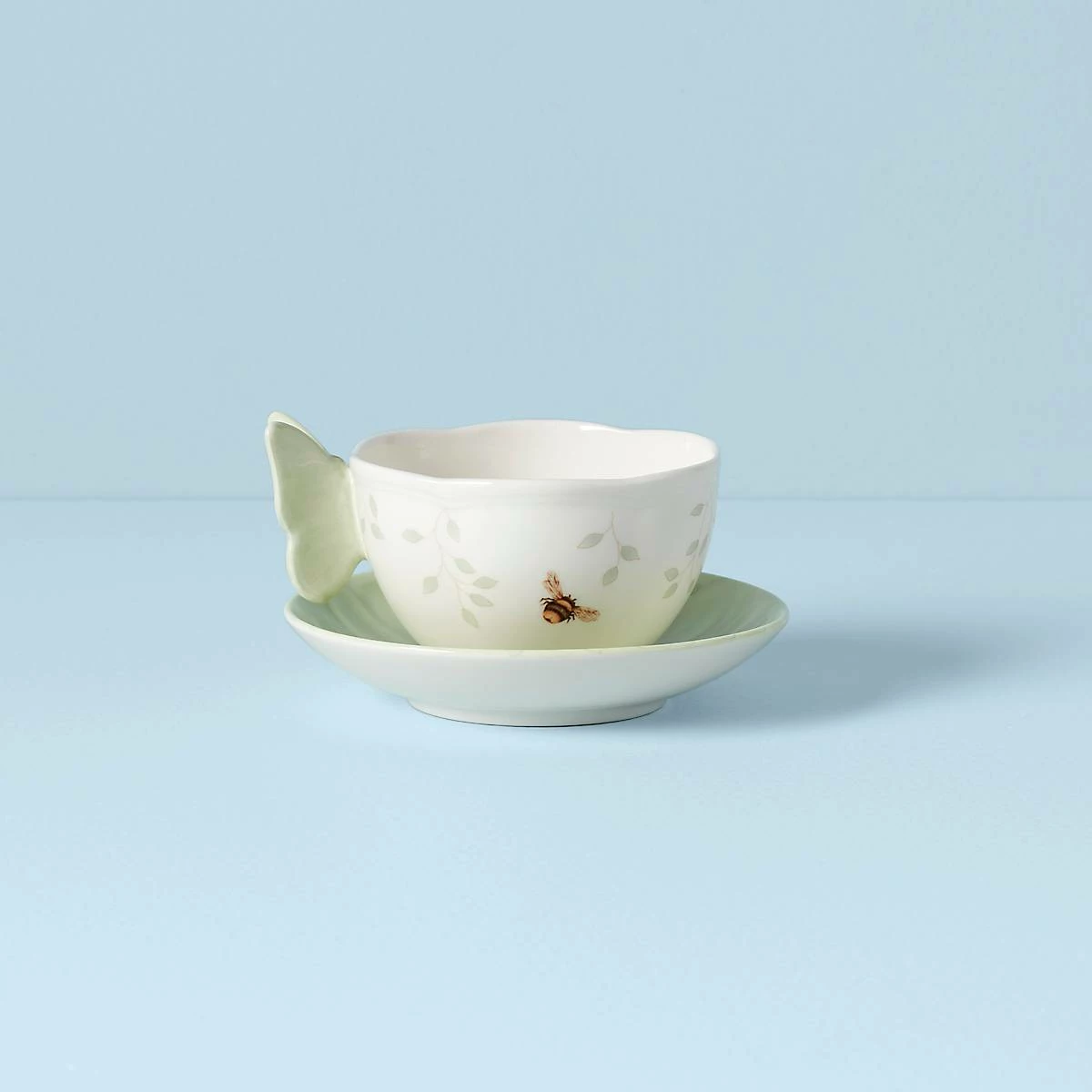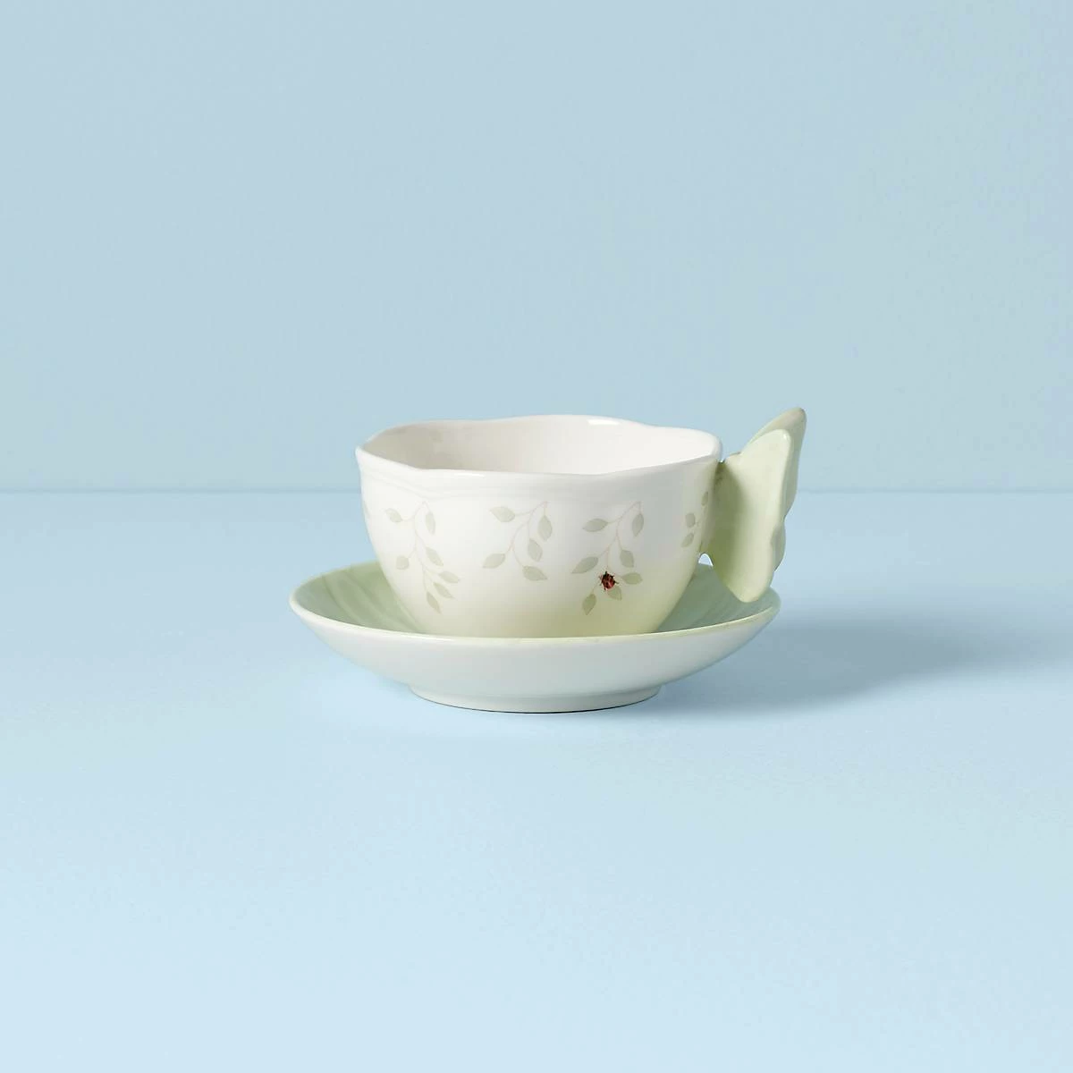 A sculptural butterfly serves as the cup’s handle in the charming Butterfly Meadow Figural Green Cup and Saucer. Both the handle and saucer form an ideal partnership with the durable white ceramic porcelain. This Lenox classic is both dishwasher and microwave-safe