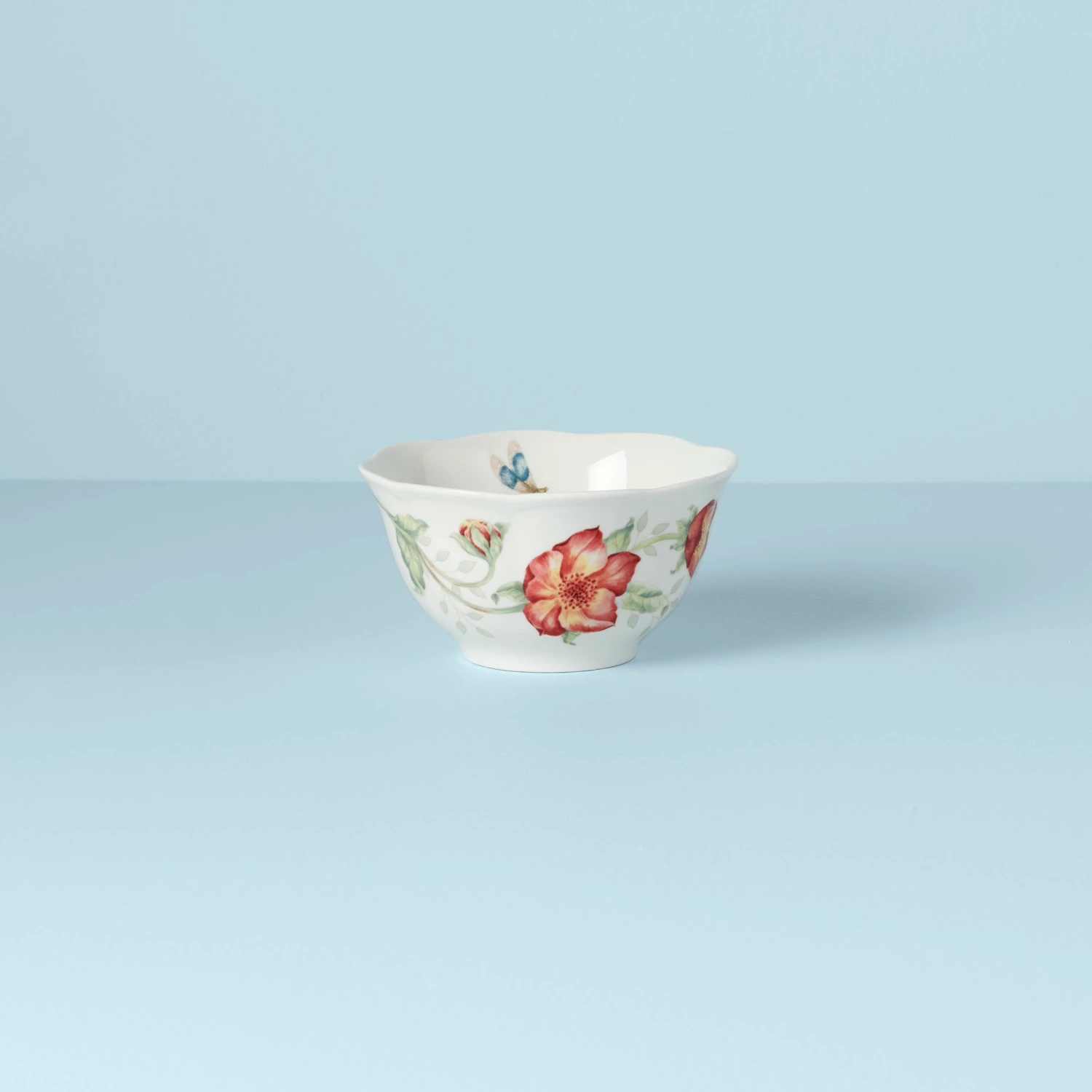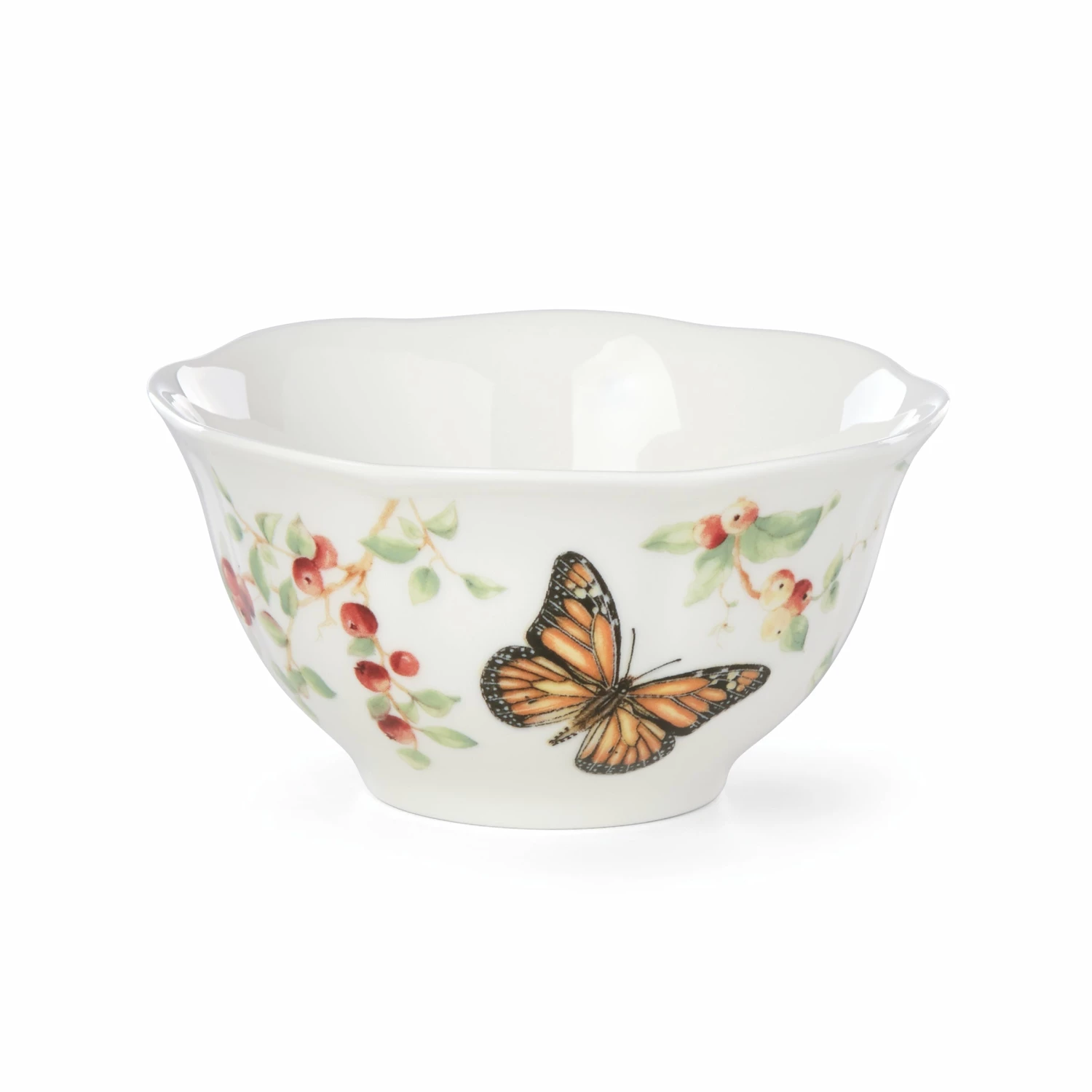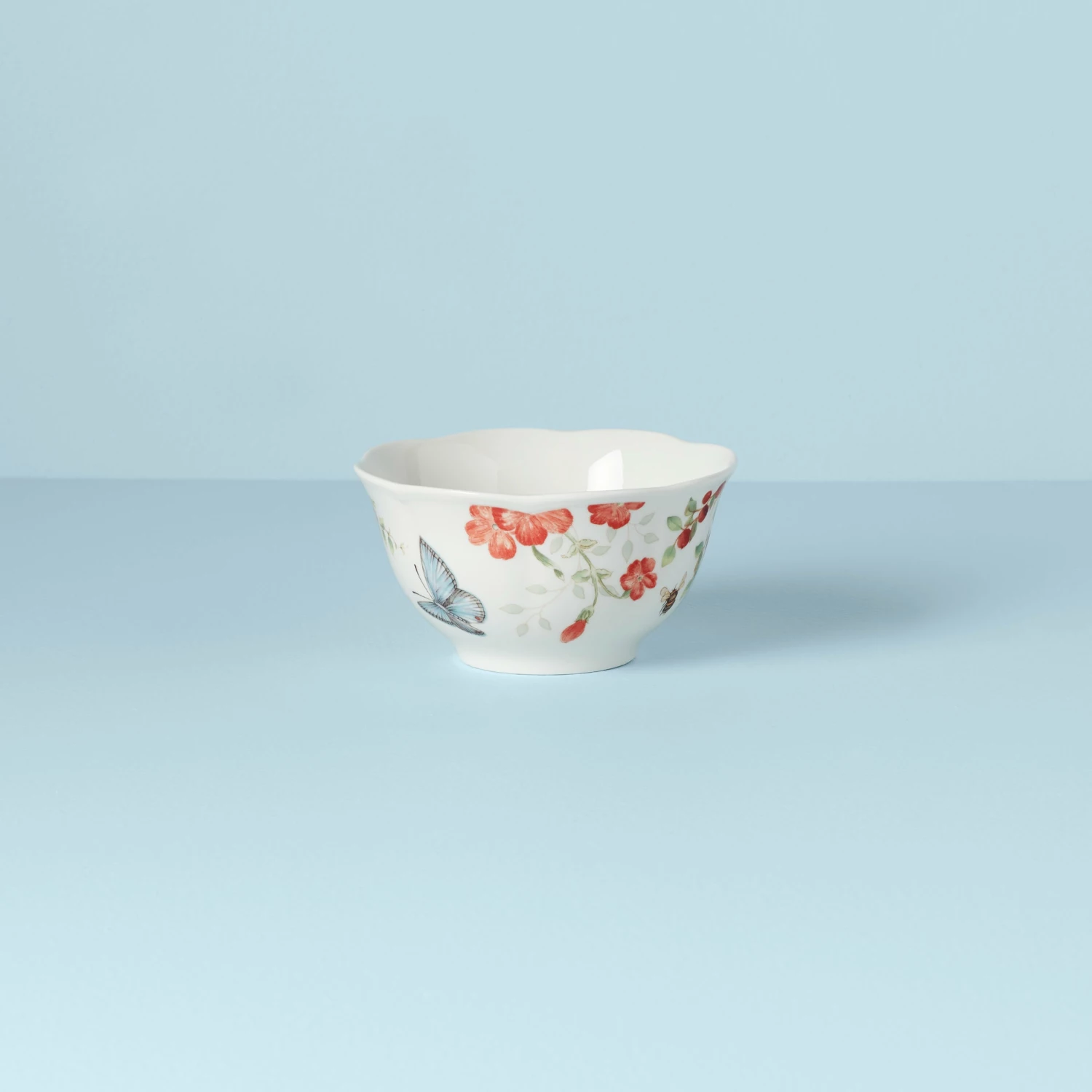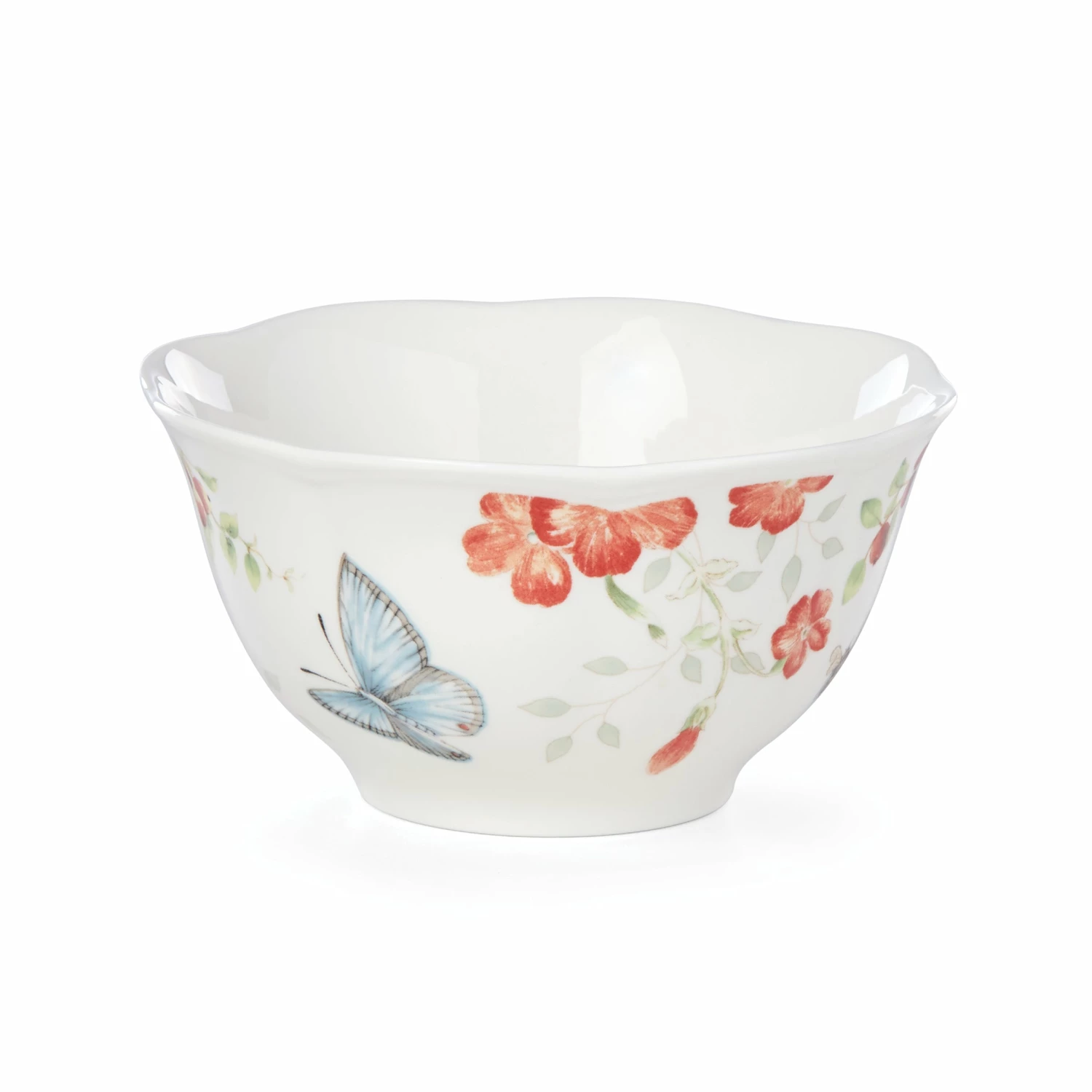 Bright red flowers add luscious detail to our charming Butterfly Meadow pattern. This bowl brings a springtime look to your table with its scalloped edge and swallowtail butterfly artistry.