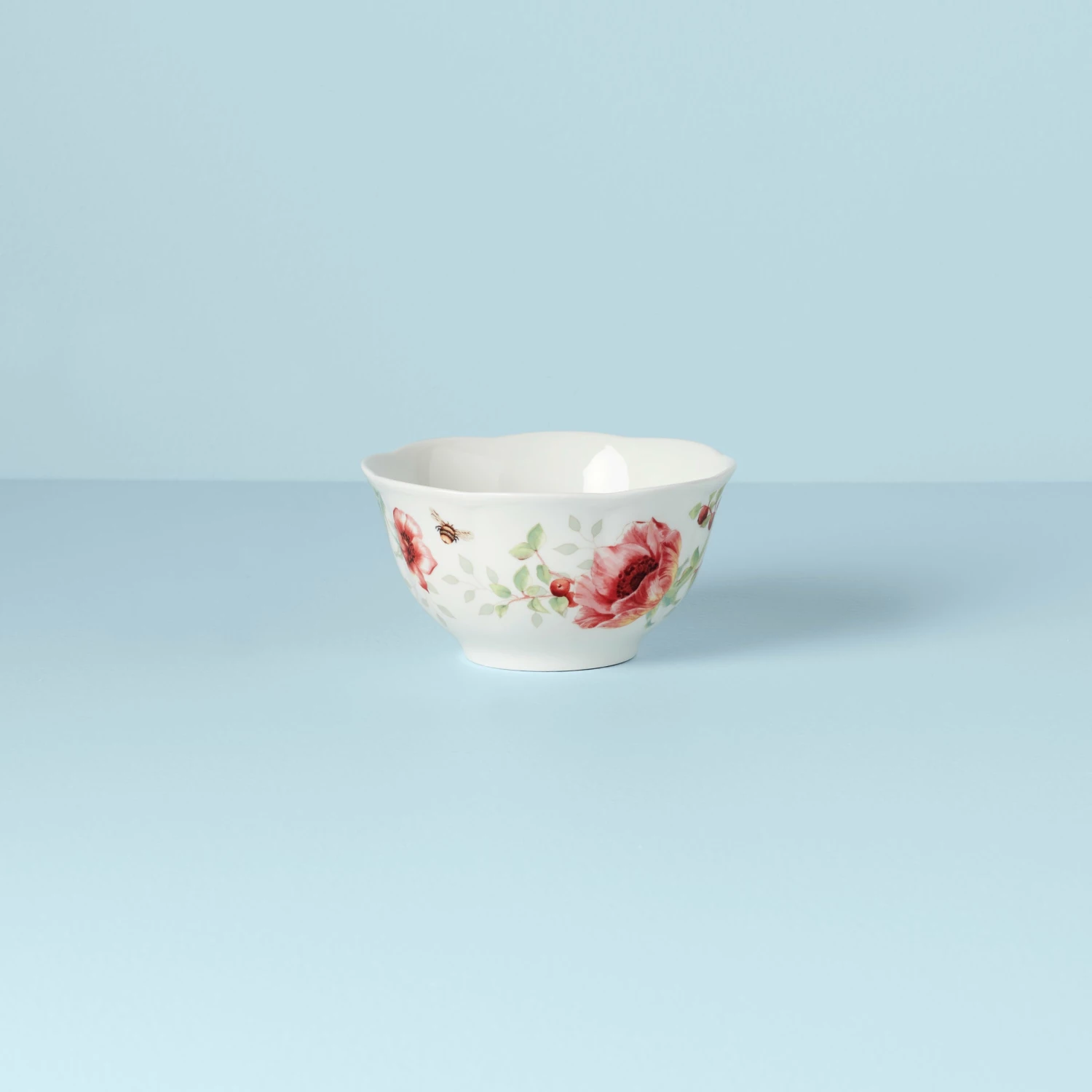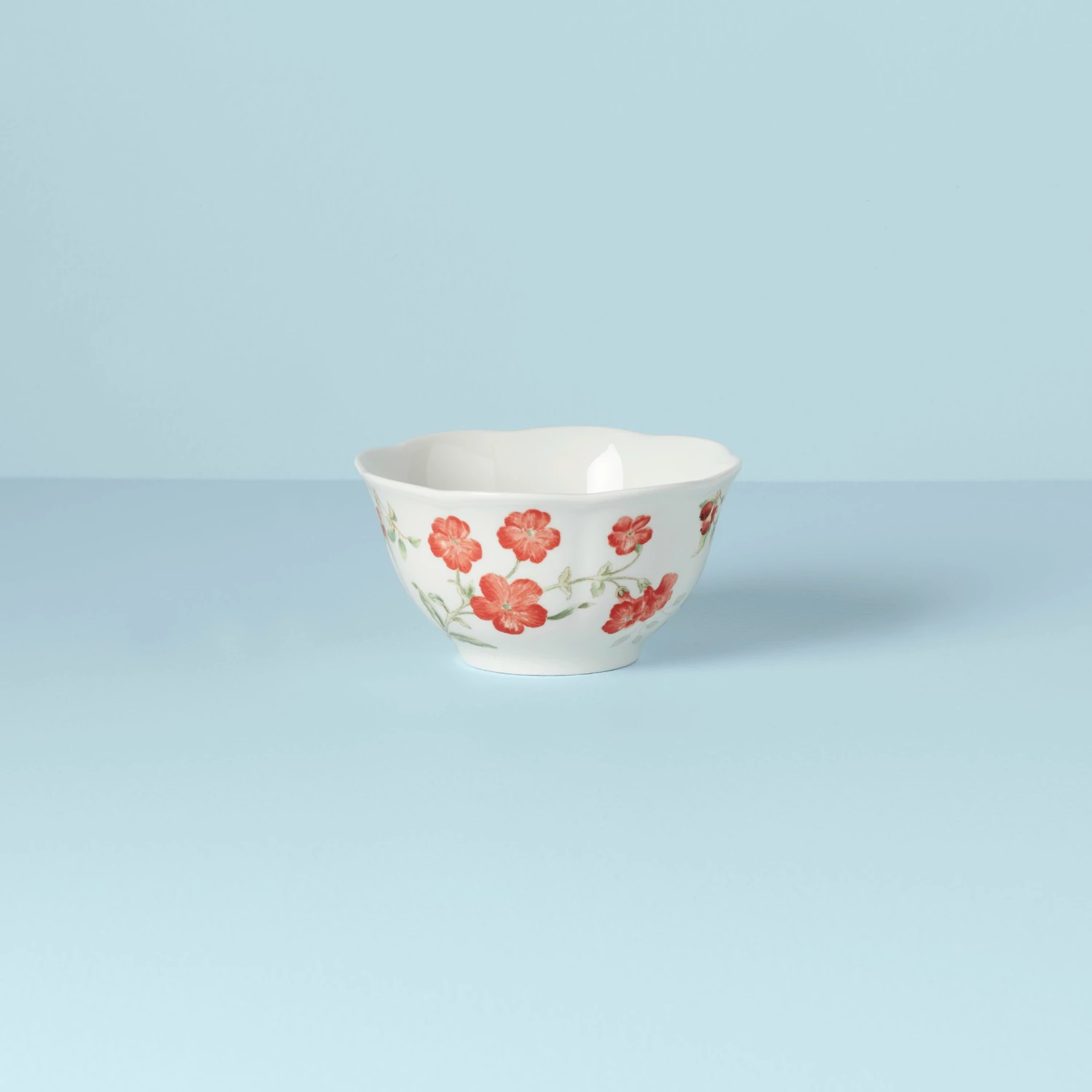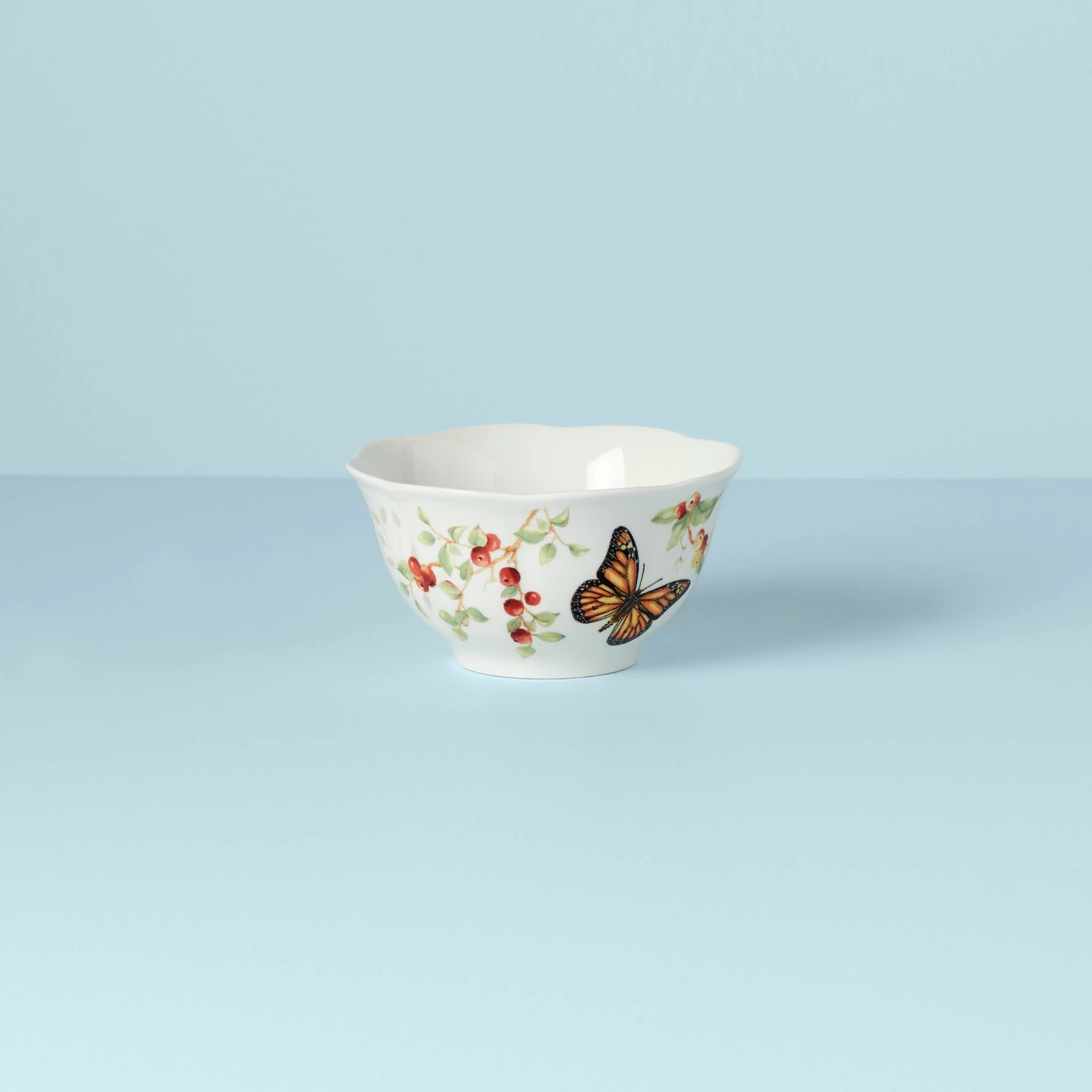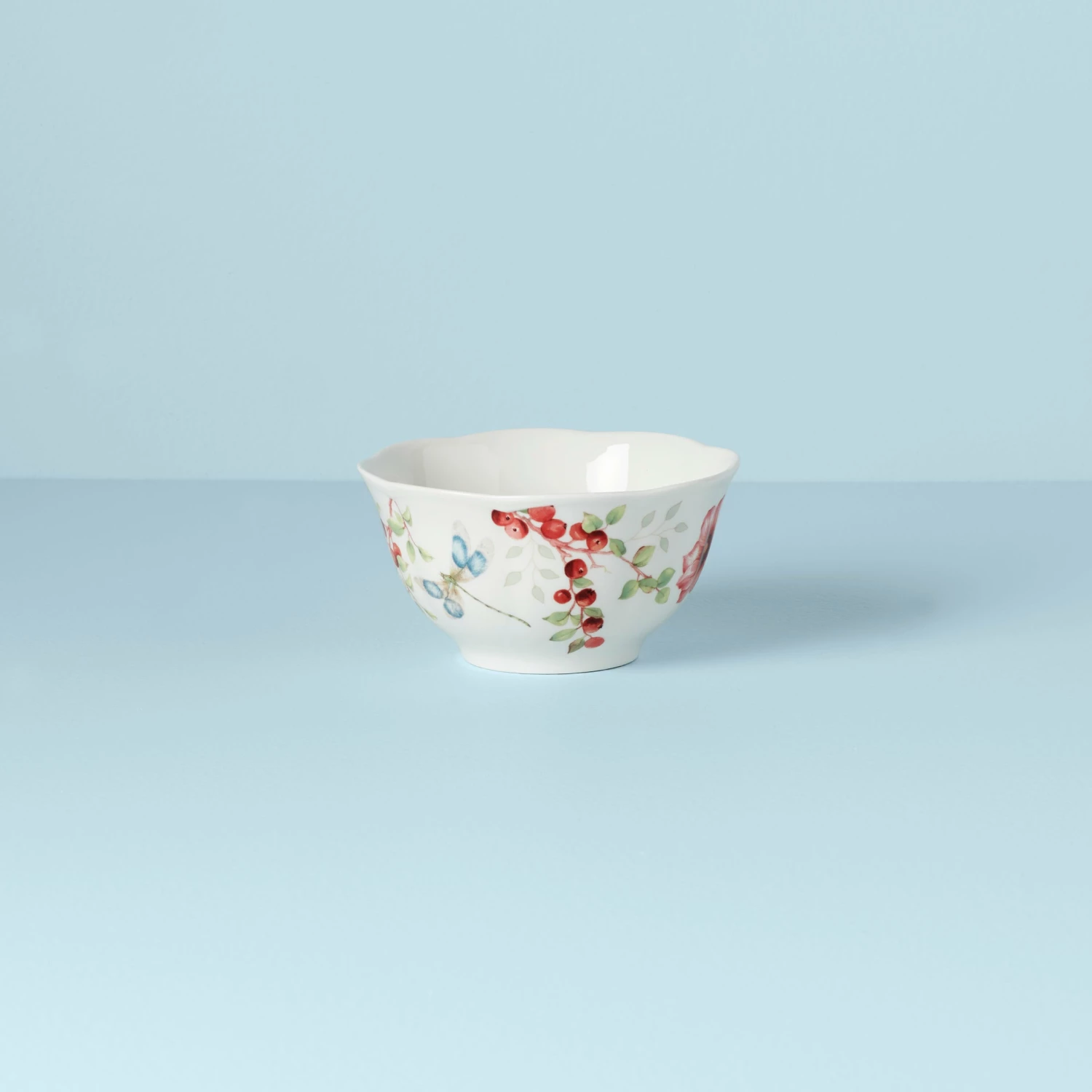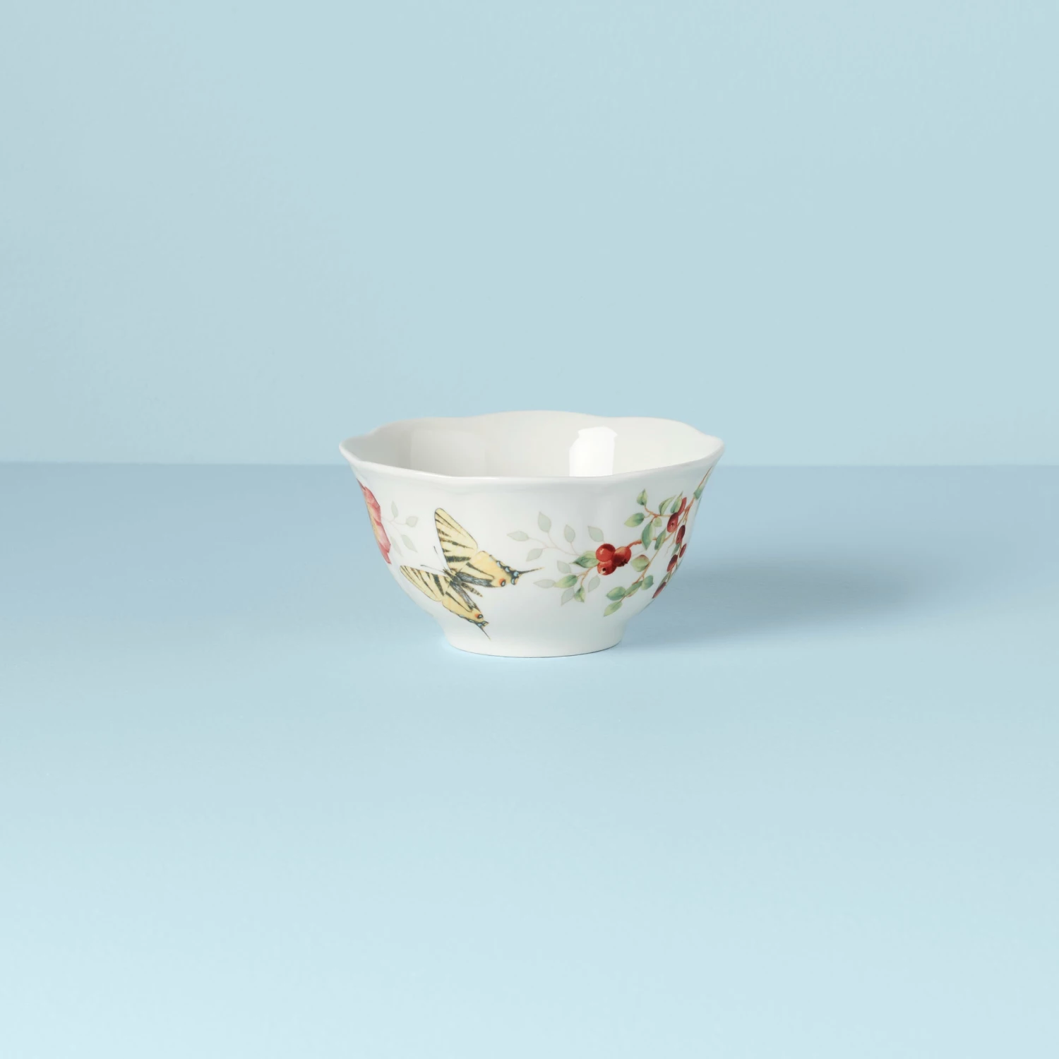 Bright red flowers add luscious detail to our charming Butterfly Meadow pattern. This bowl brings a springtime look to your table with its scalloped edge and swallowtail butterfly artistry.
