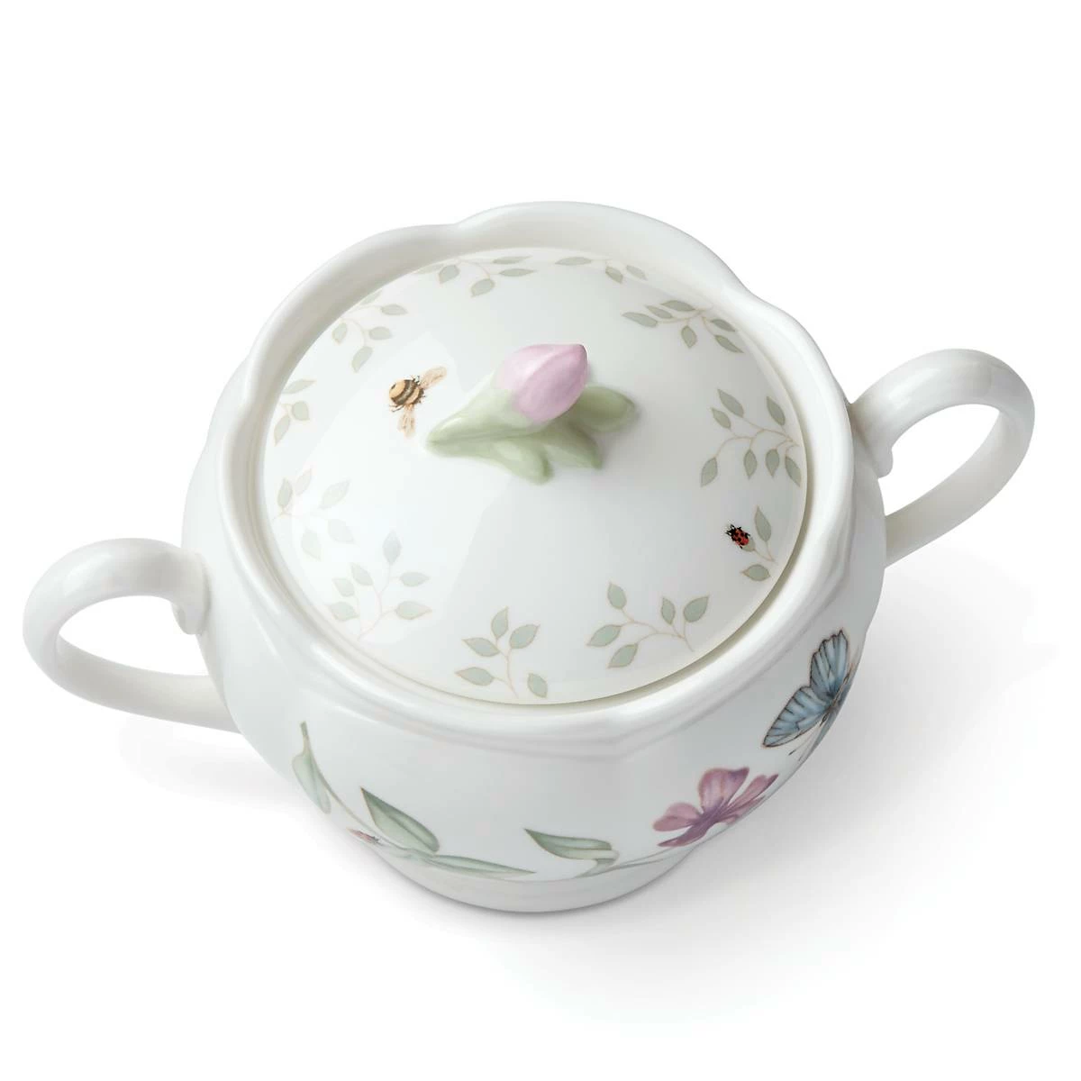 A sculpted pink flower forms a charming finial on the lid of the Butterfly Meadow Sugar Bowl. Two handles on either side boast an elegant contour, while the Butterfly Meadow’s classic garden illustrations take the stage across the durable white ceramic porcelain surface. This sugar bowl is dishwasher and microwave-safe.