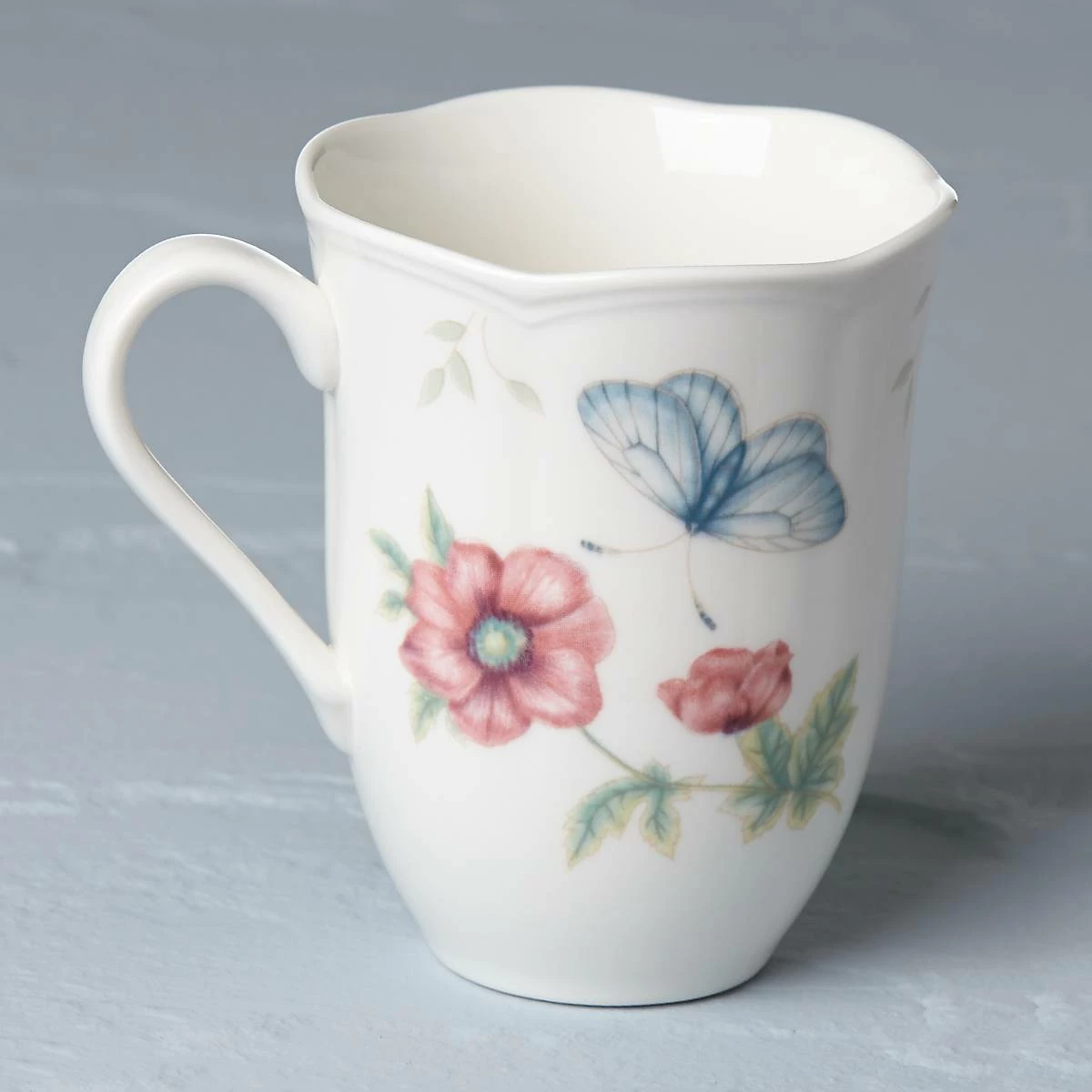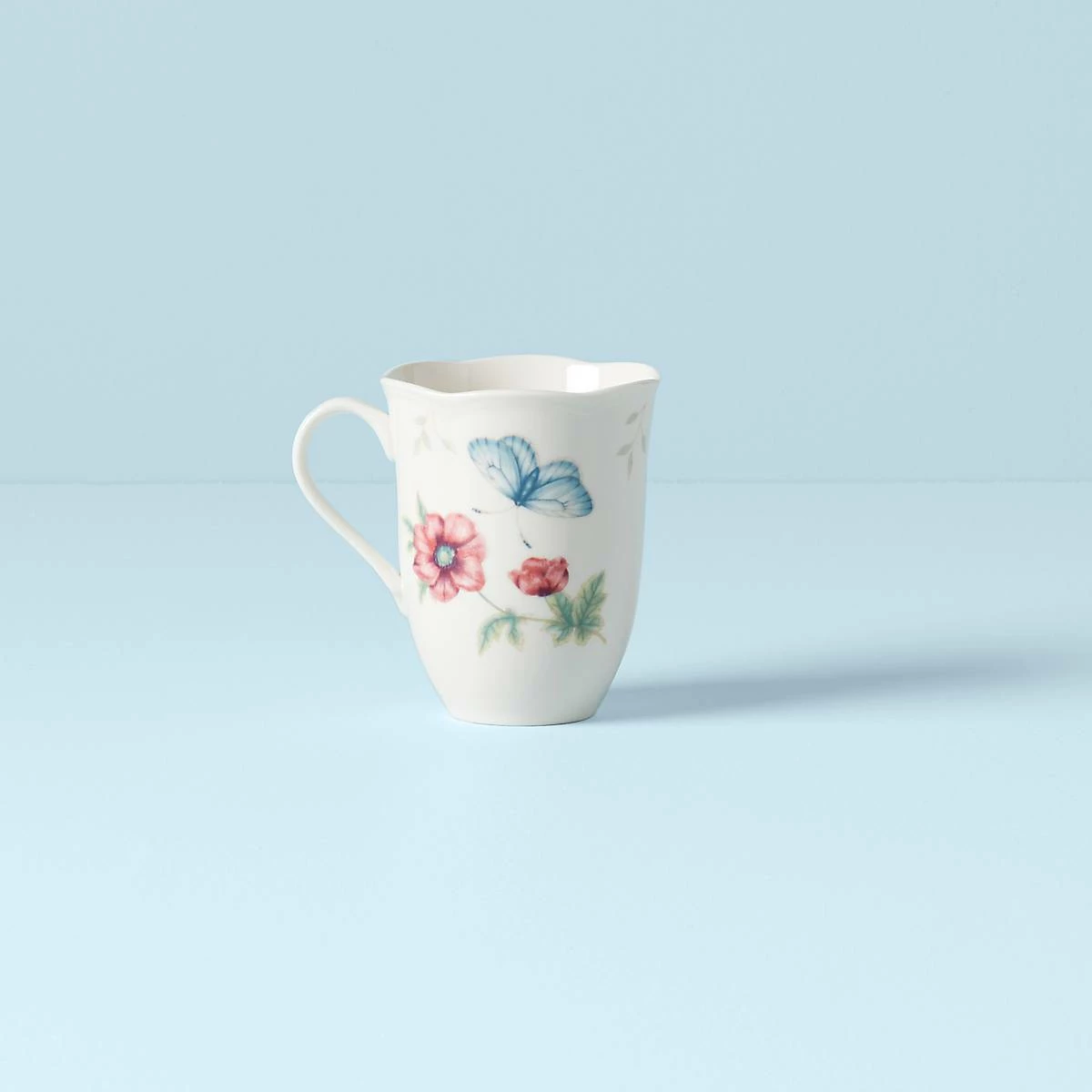 Lively blossoms tempt colorful butterflies amidst motifs of light-palate foliage. Crafted from durable ceramic porcelain with scalloped edges and a petite handle, the Butterfly Meadow Tiger Swallowtail Mug is dishwasher and microwave-safe for a charming and functional kitchen addition.