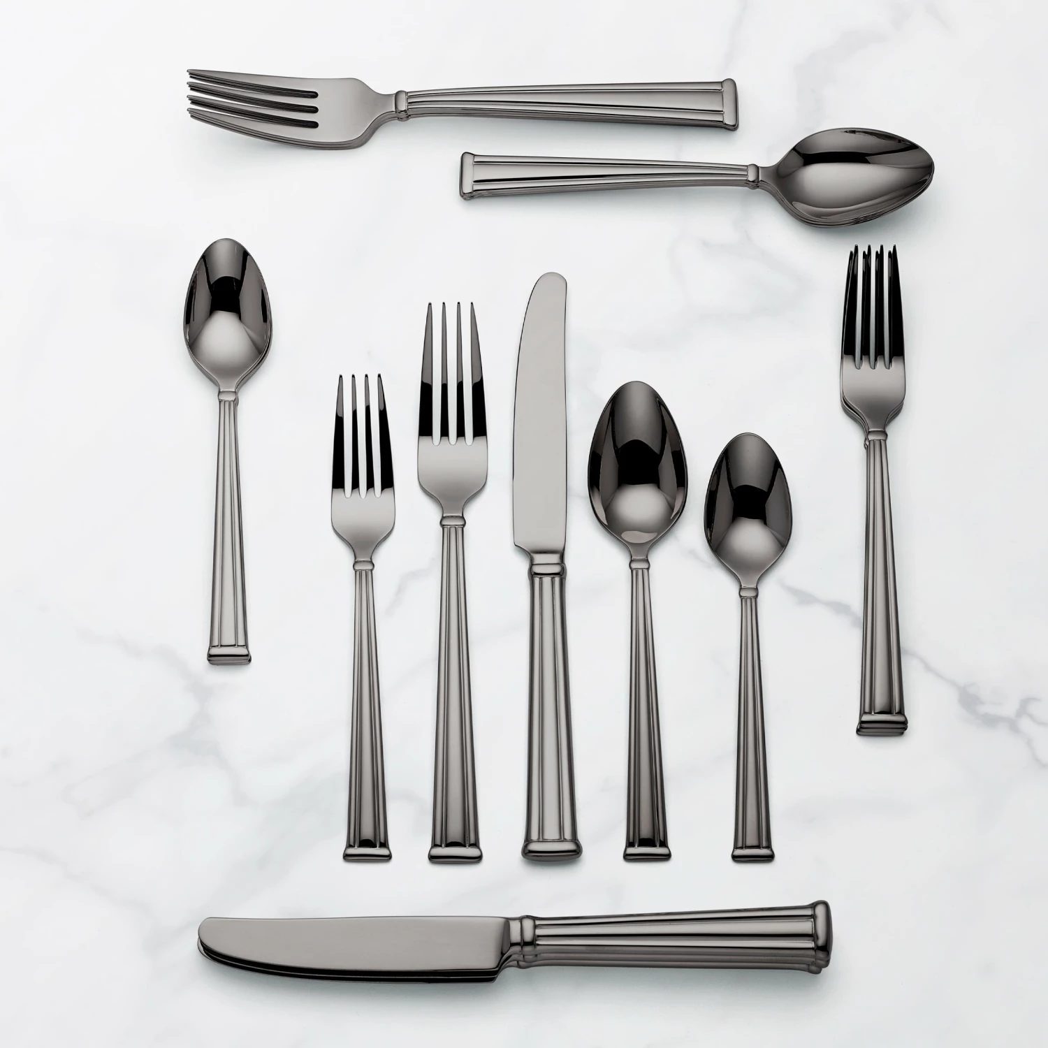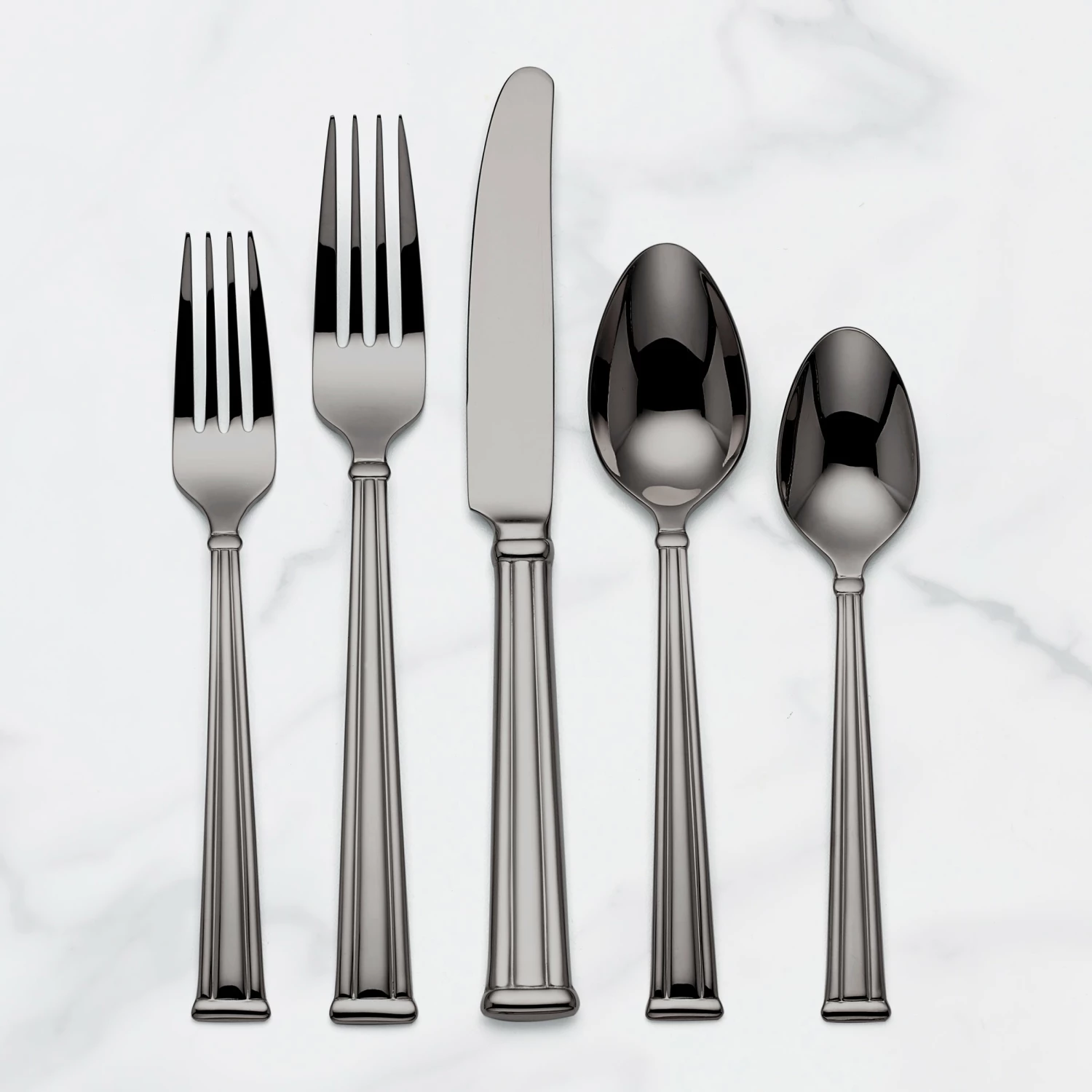Slim lines create a visually pleasing column design along the handles of this 20-piece flatware set. Choose from three different types of metallic to match back to your dinnerware. Crafted of 18/10 stainless steel for durability and long-lasting rust resistance. The 20-piece set comes with four forks, four knives, four spoons, four salad forks and four teaspoons.
