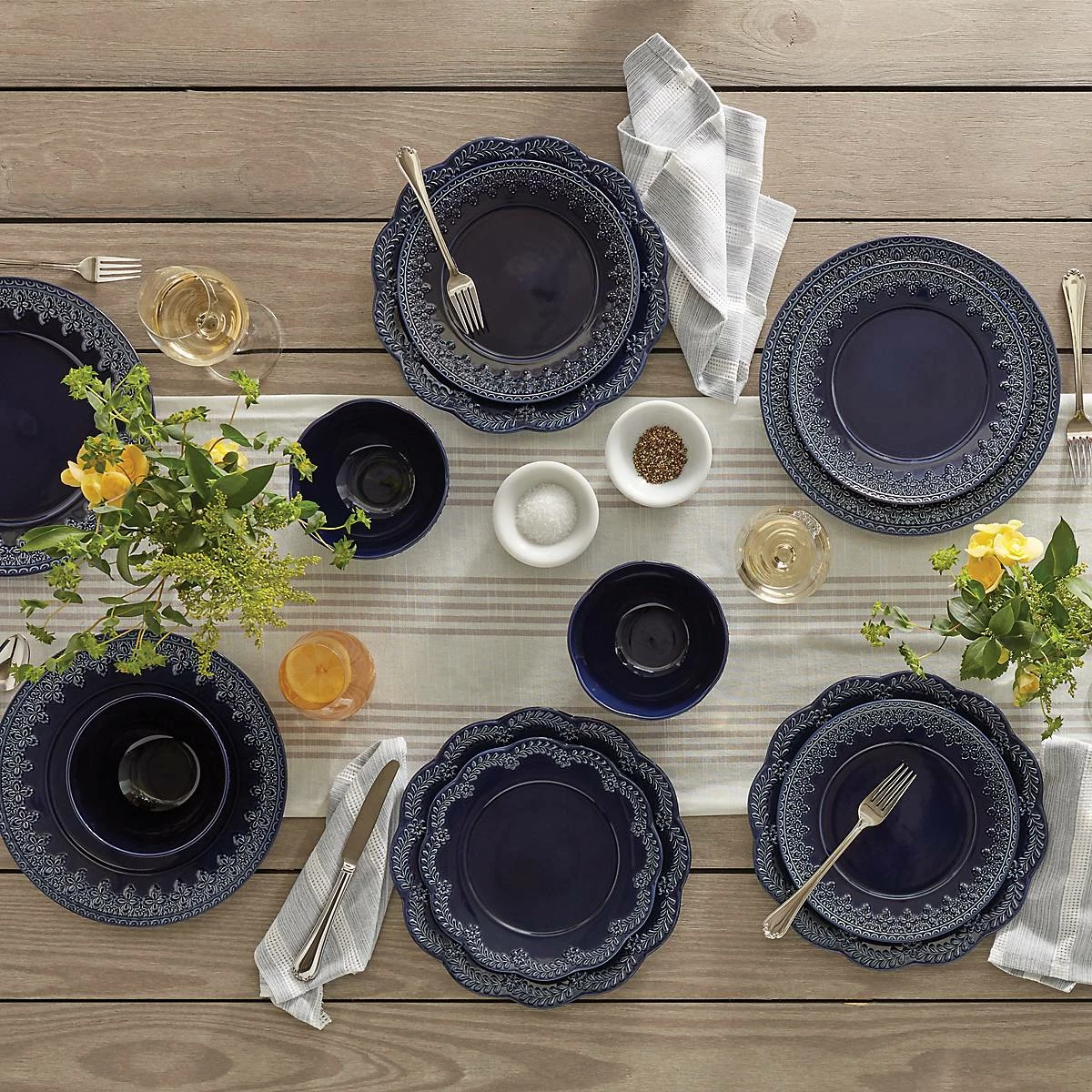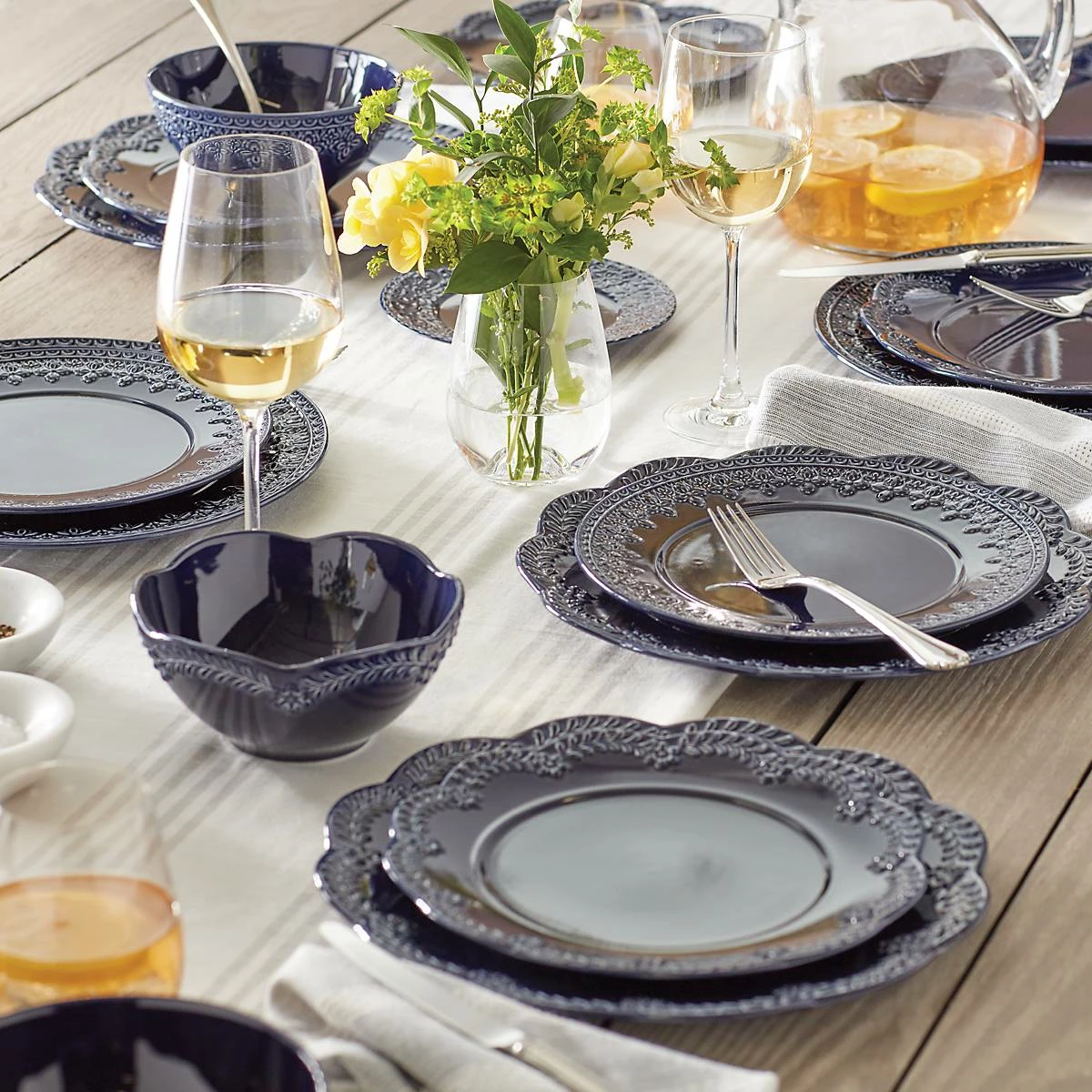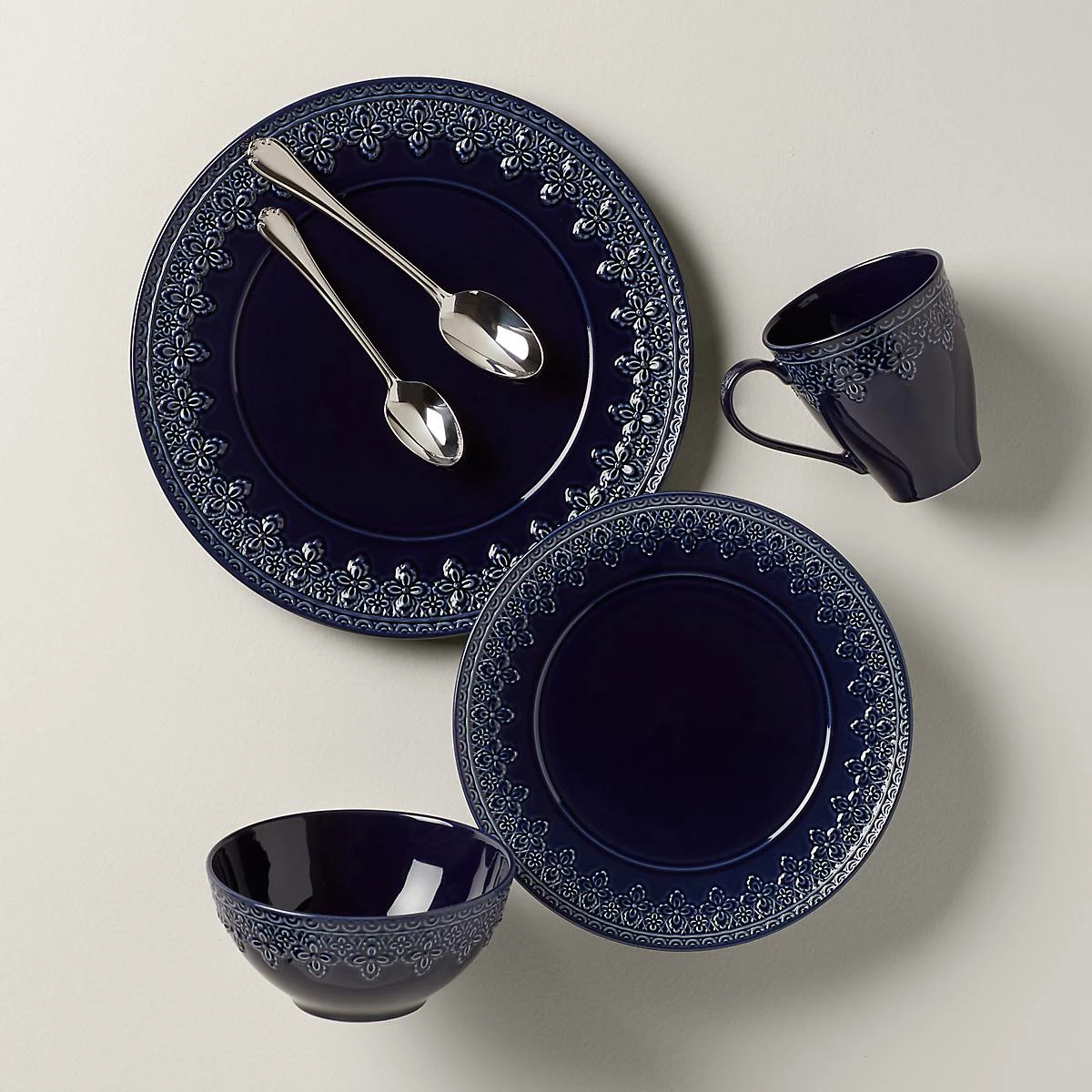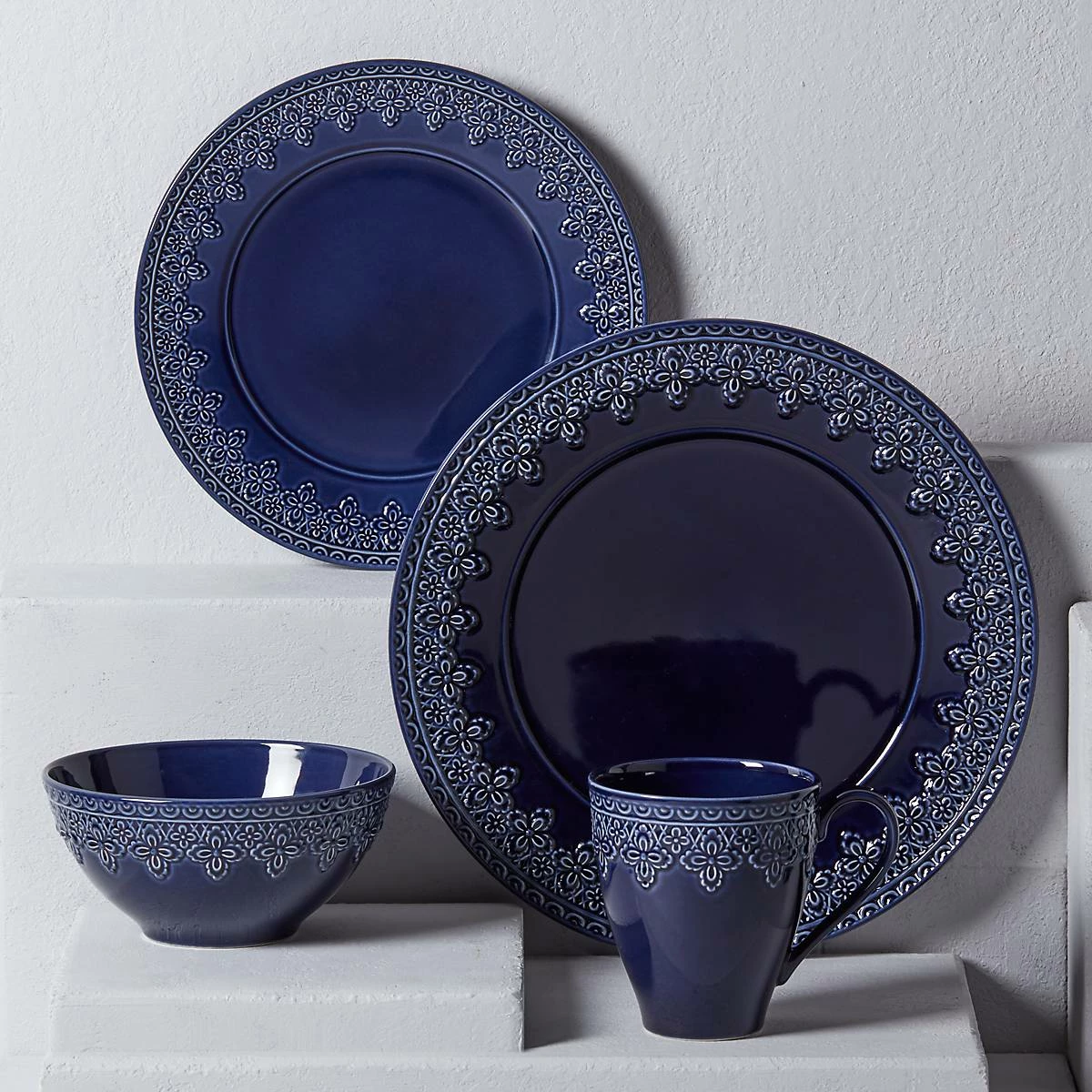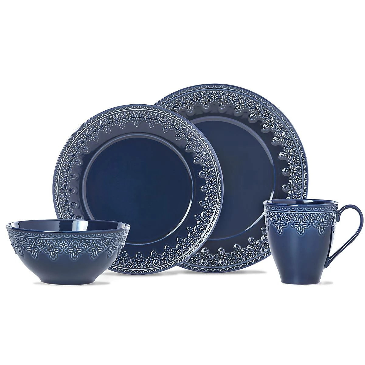 Reminiscent of French matelassΓ© technique, The Chelse Muse Fleur Navy 4-piece Place Setting boasts an intricate quatrefoil pattern carved around the edges with a reactive glaze. This rich navy ironstone dinnerware is dishwasher and microwave-safe.