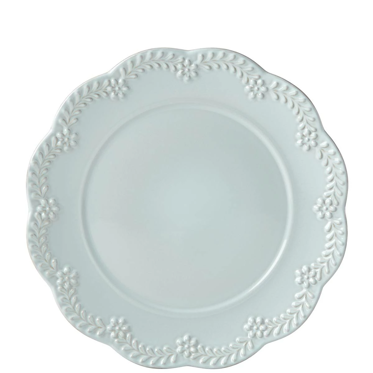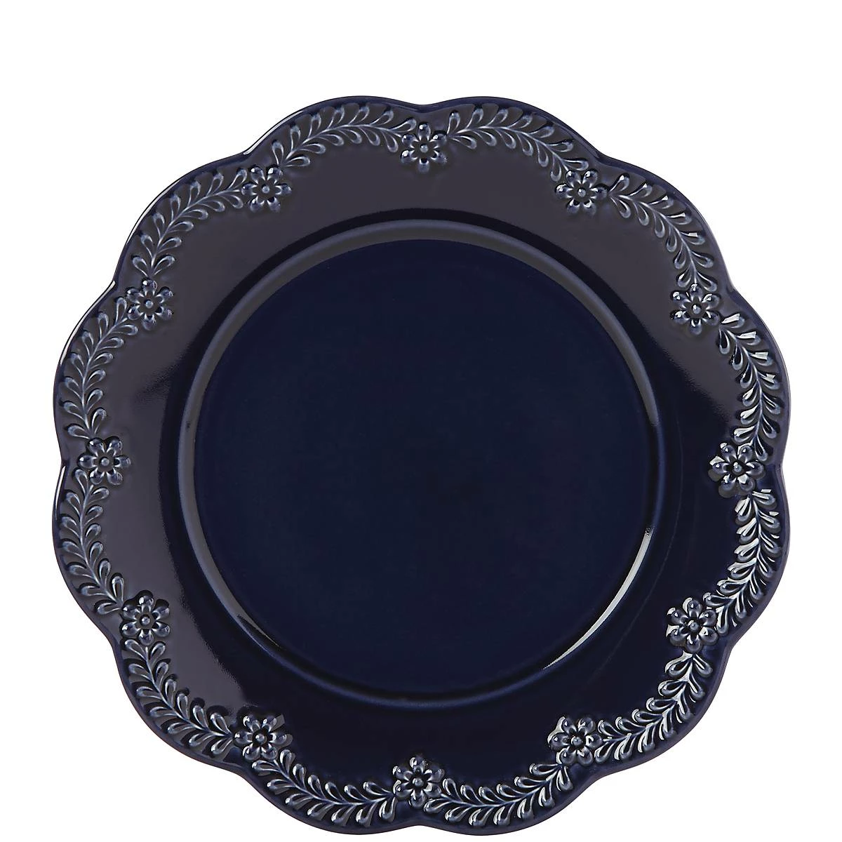 The Floral Navy Accent Plate showcases an elegant wreath of opposite-leafed branches and flowers following scalloped edges with a reactive glaze. This dishwasher and microwave-safe dinnerware from the Chelse Muse Collection is crafted in navy ironstone.
