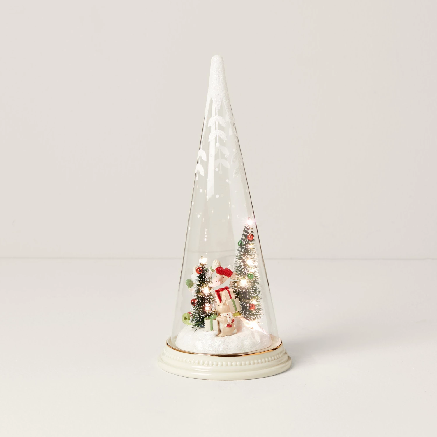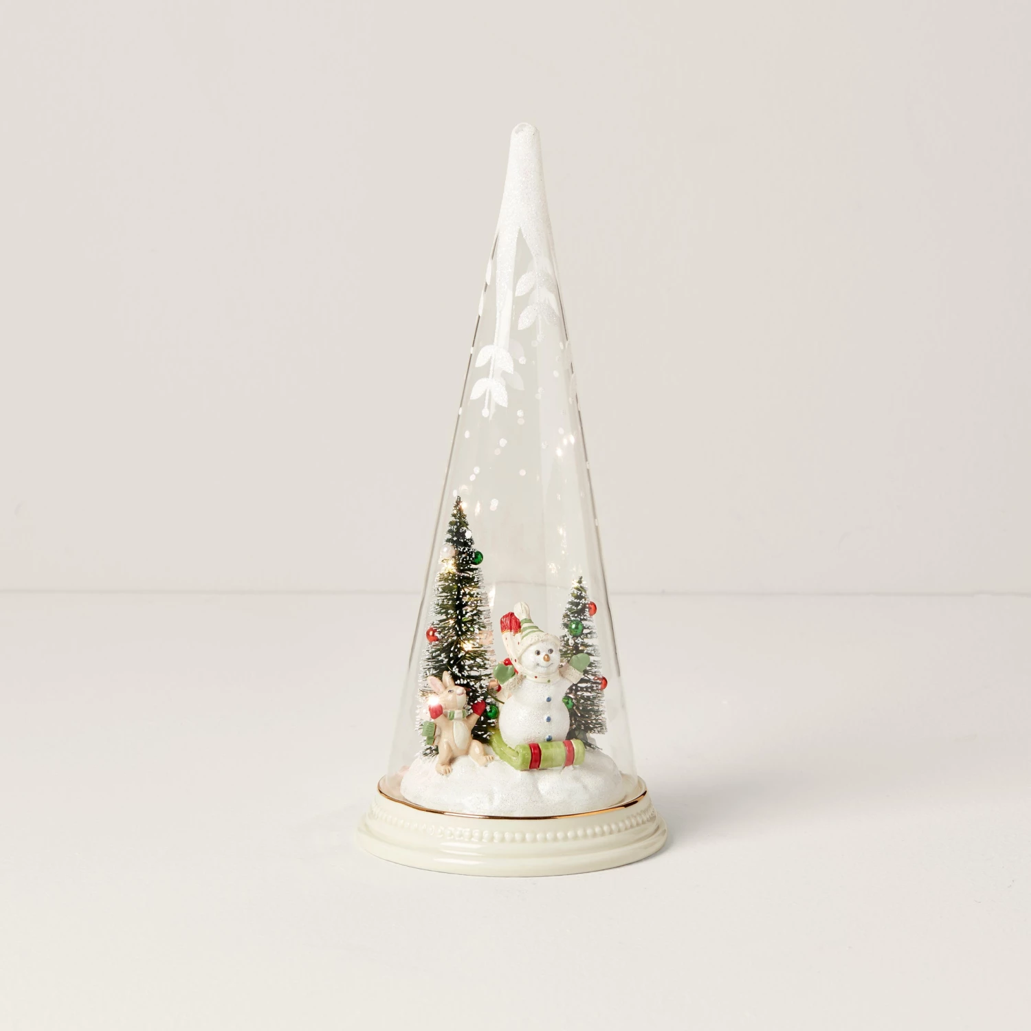 A charming winter scene unfolds with snowman sledding inside this light-up glass tree cone. It makes an elegant piece of Christmas decor and a treasured gift that no one will forget.