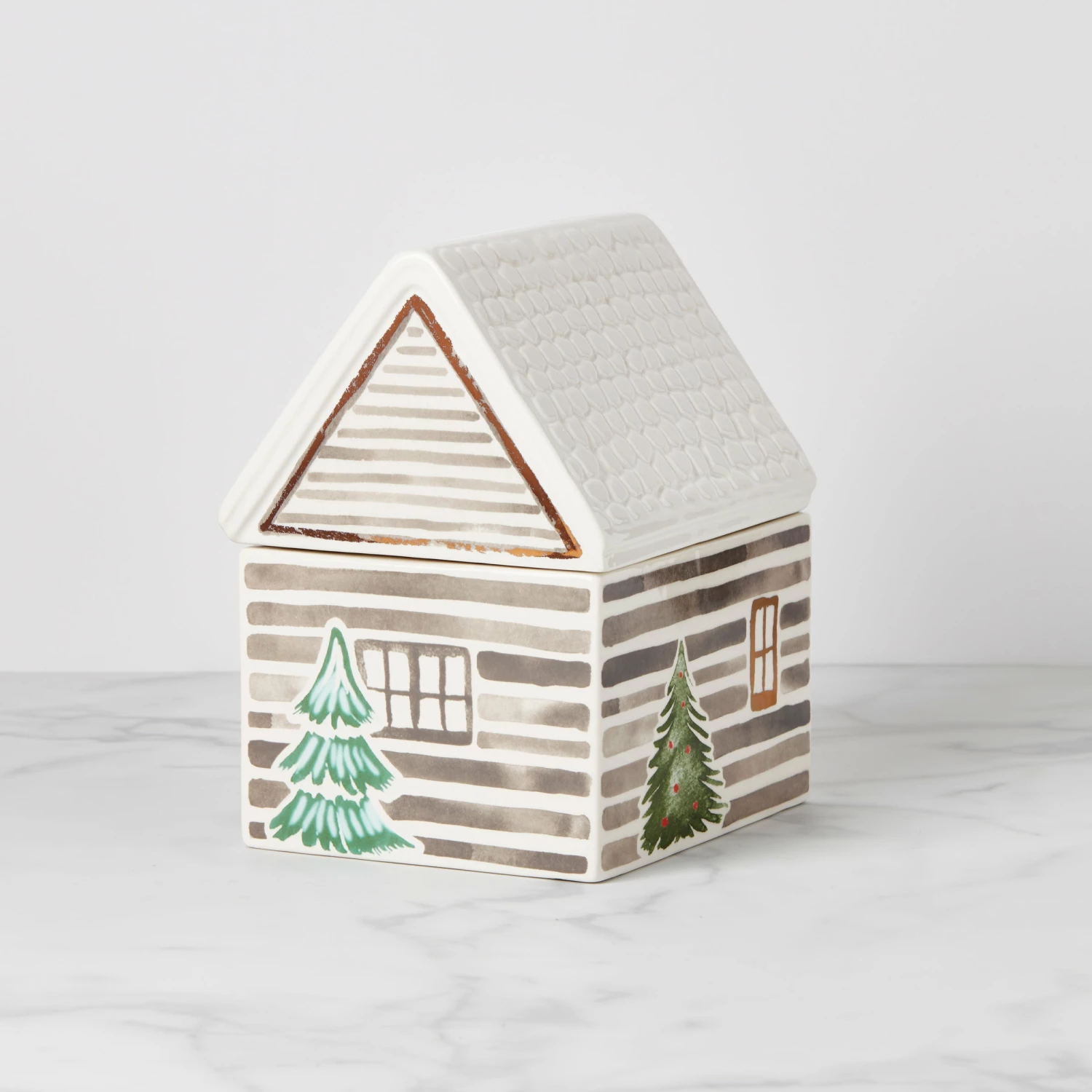 Decorated in our wintry Balsam Lane motif, this cookie jar is shaped like a cabin and features cute details like a Christmas tree, a cardinal and a textured brick design on the roof. Pull off the lid and store cookies, candy and other treats inside!