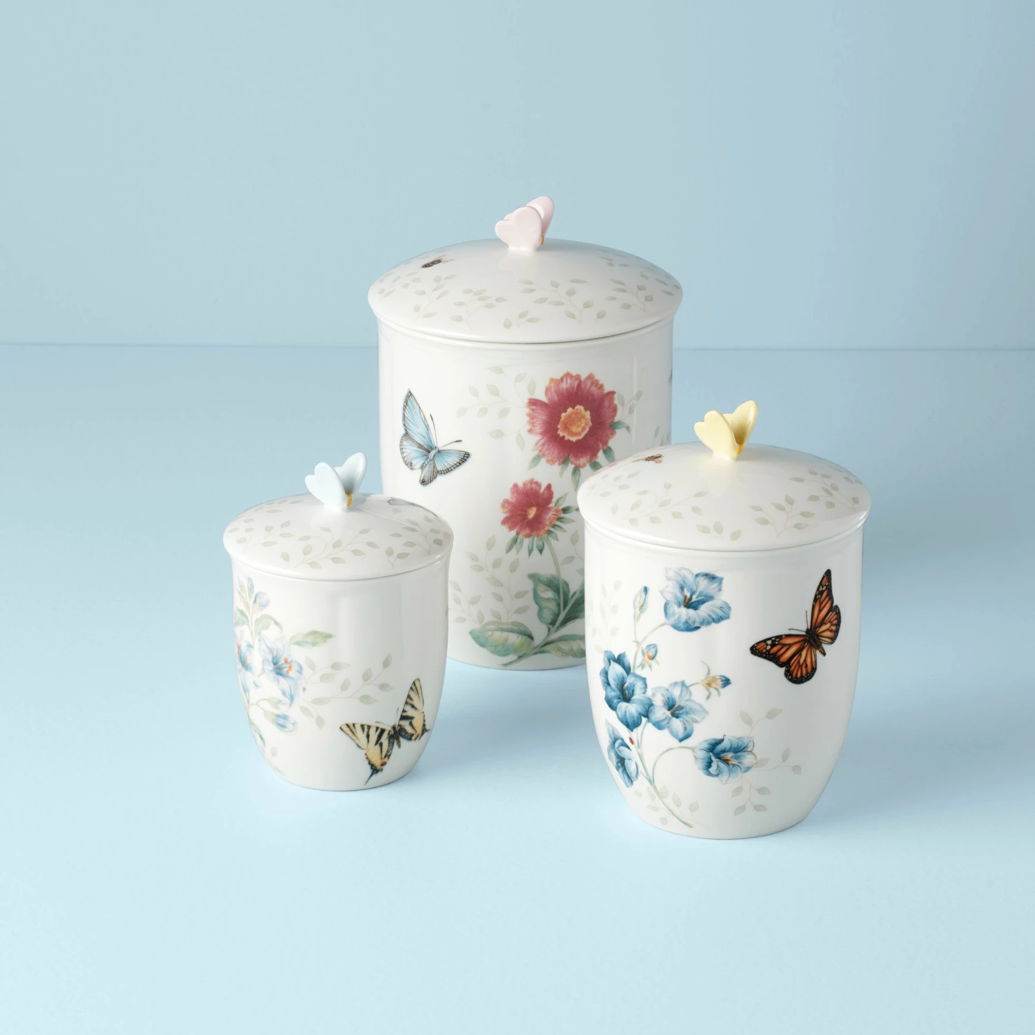 A lively motif of butterflies, bees and flowers adorns the white porcelain surface of this Butterfly Meadow 3-piece canister set. These durable porcelain containers each feature a butterfly finial and are ideal for storing dry ingredients.