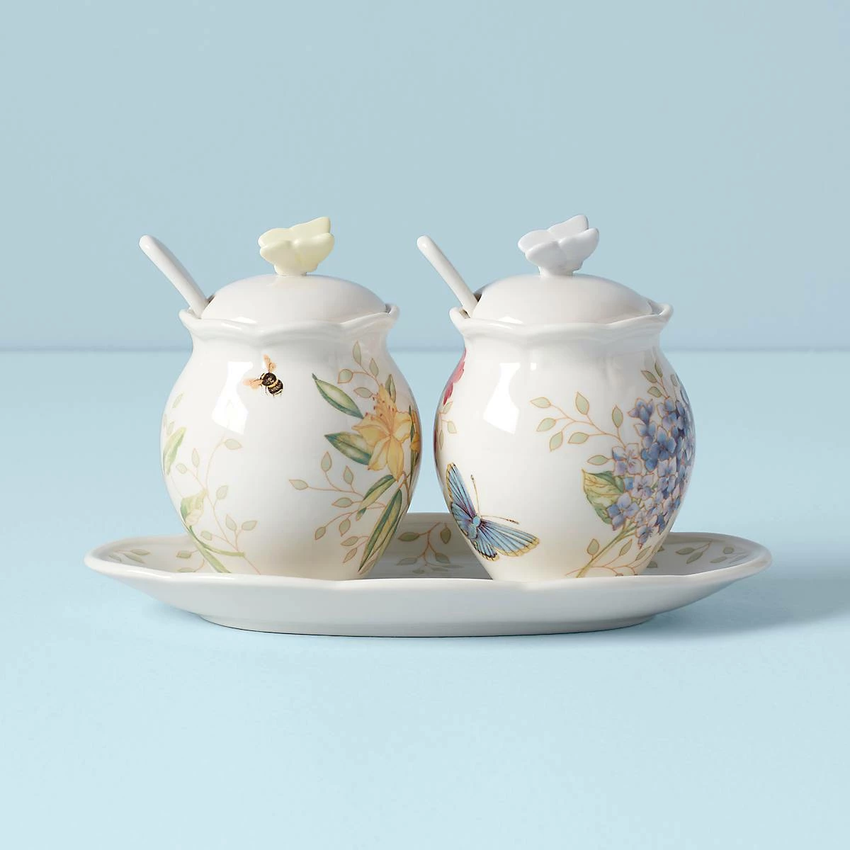 The Butterfly Meadow 7-piece Condiment Set features the classic garden illustration on the durable white ceramic earthenware tray and servers. Both servers include spoons and a lid with a perched butterfly finial. This set is dishwasher-safe, for added convenience.