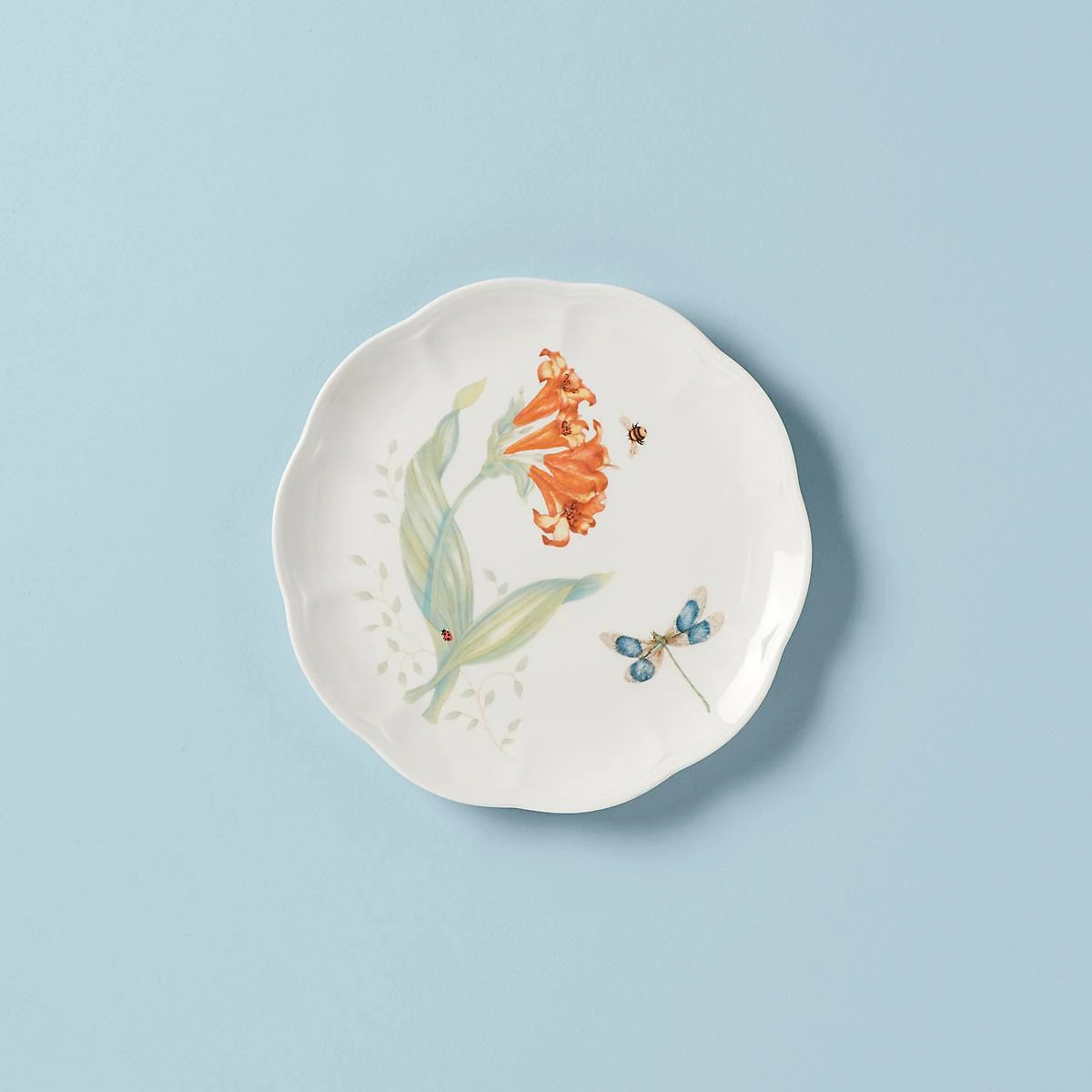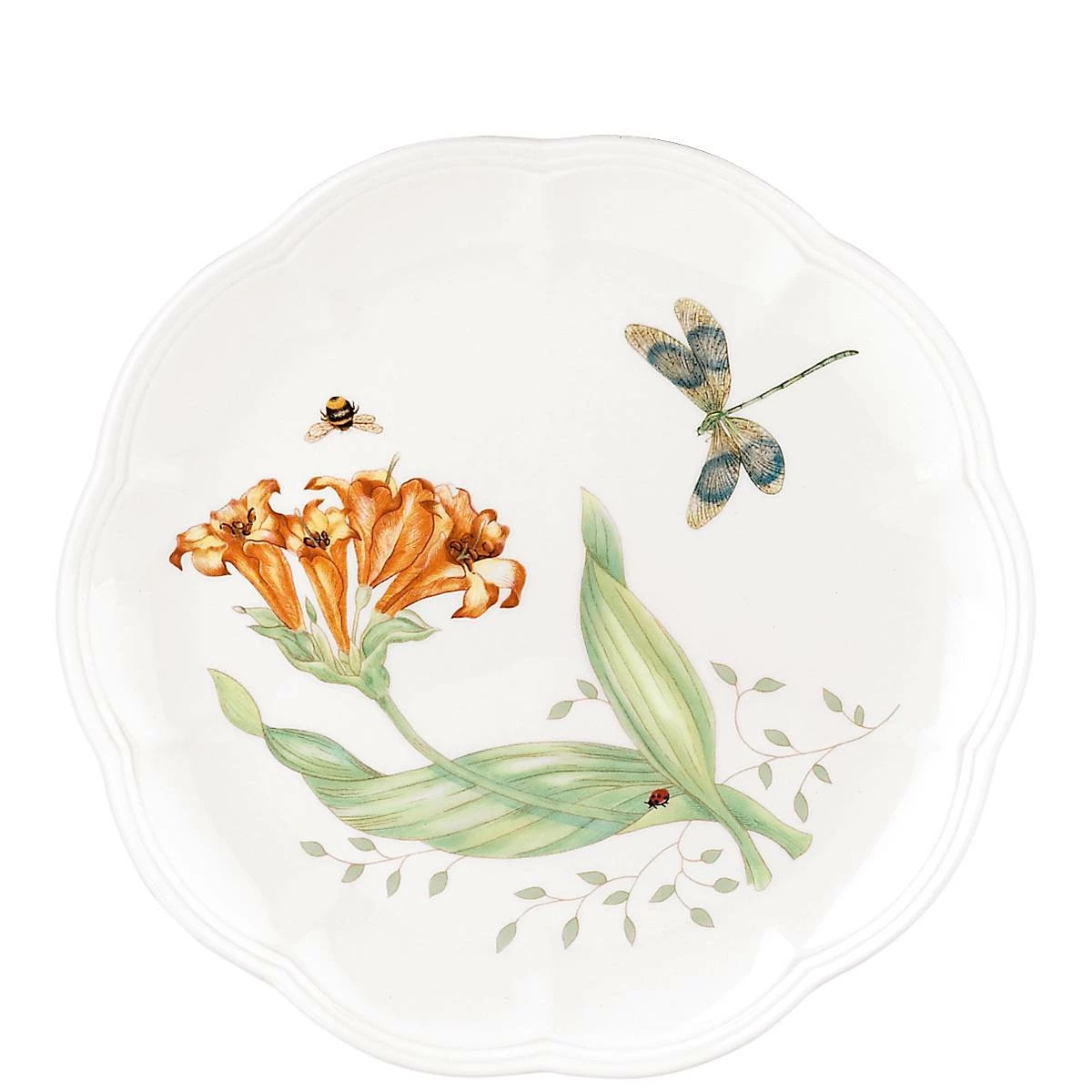 A lively illustration of a dragonfly, bumblebee, and ladybug navigate a vibrant flower design on the Butterfly Meadow Dragonfly 9″ Accent Plate. With elegant scalloped edges on durable white ceramic porcelain, this mix-and-match classic is designed for outstanding freezer-to-oven-to-table performance, and is microwave and dishwasher-safe.