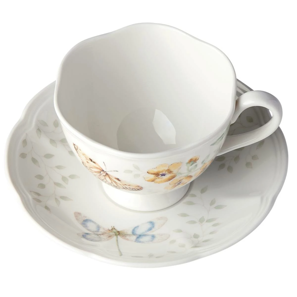 The durable white ceramic porcelain Fritillary Cup and Saucer boast scalloped edges with a vibrant springtime illustration of flowers and butterflies. From the Butterfly Meadow Collection, the cup and saucer are dishwasher and microwave-safe.