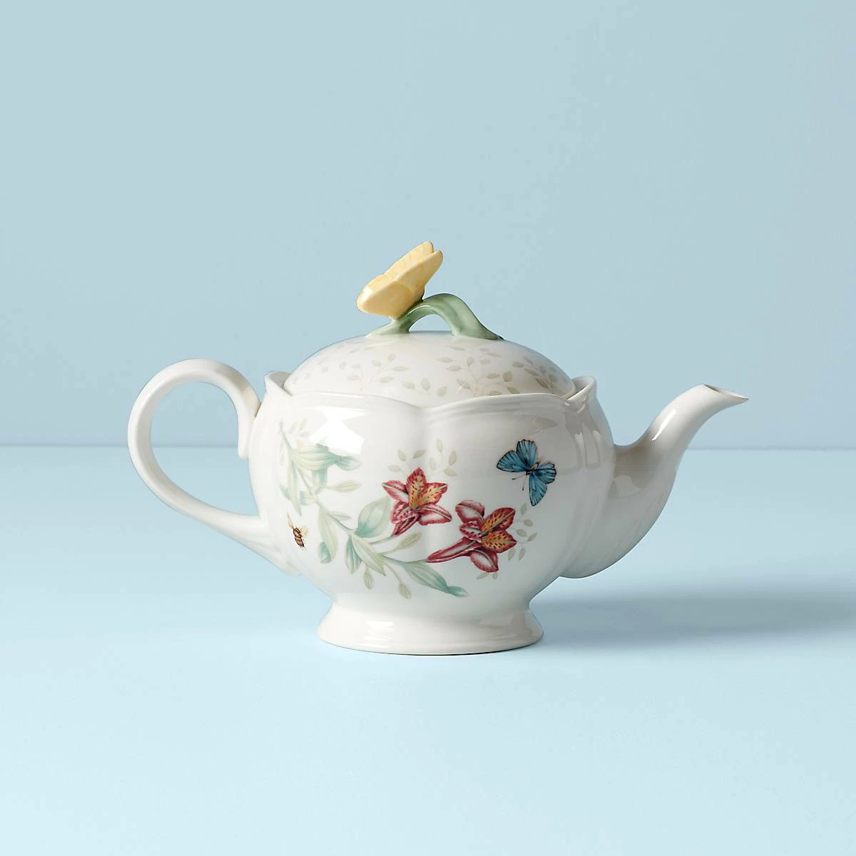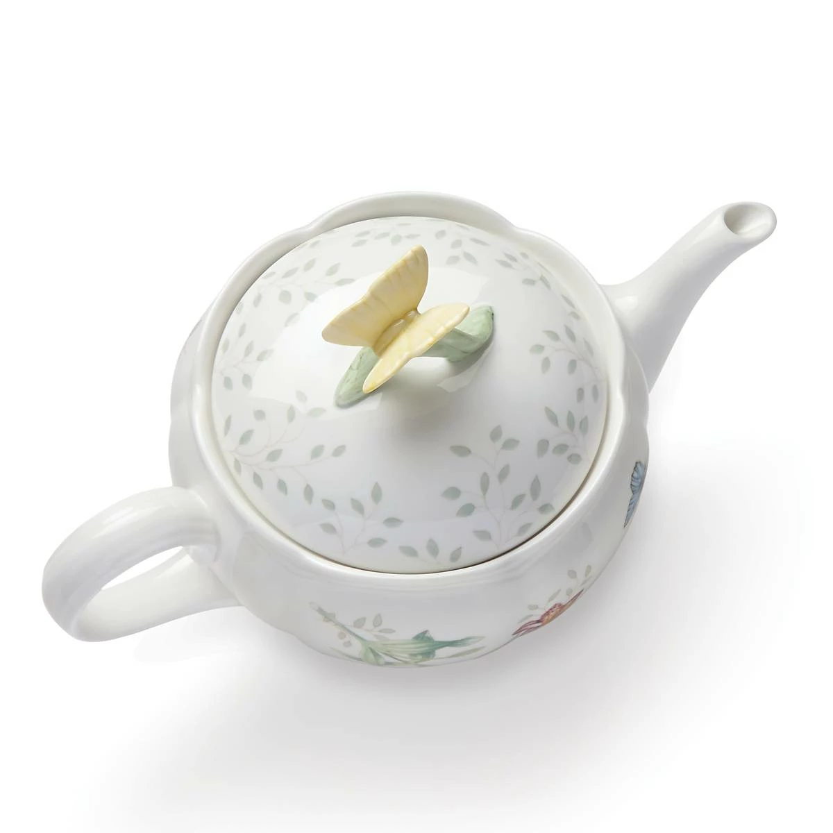 A sunny yellow butterfly tops off the lid of this charming Butterfly Meadow teapot. Crafted of durable porcelain with a lively floral pattern, it’s a must-have for tea time (or any time!) Complete with a delicate scalloped finish for a lovely look. Plus, it’s both microwave and dishwasher safe!