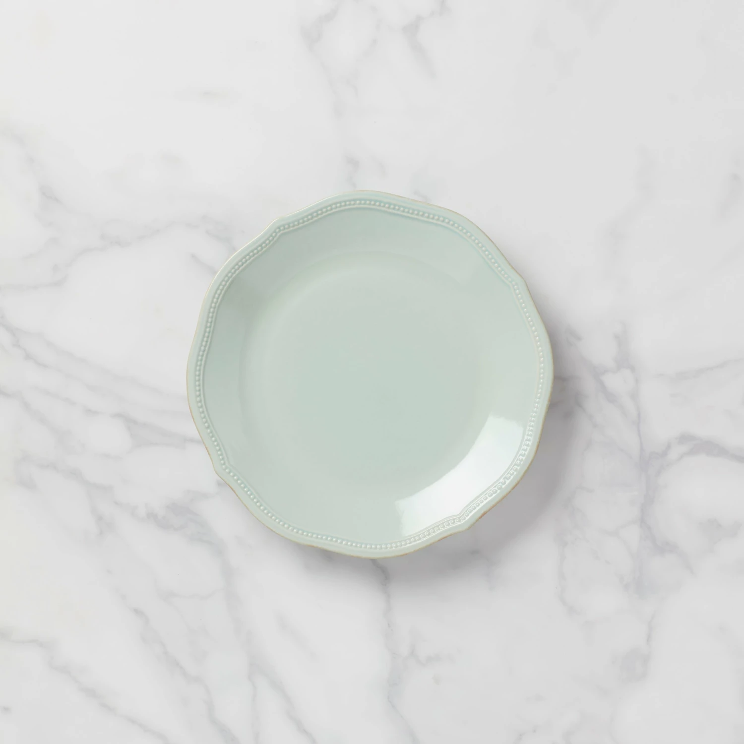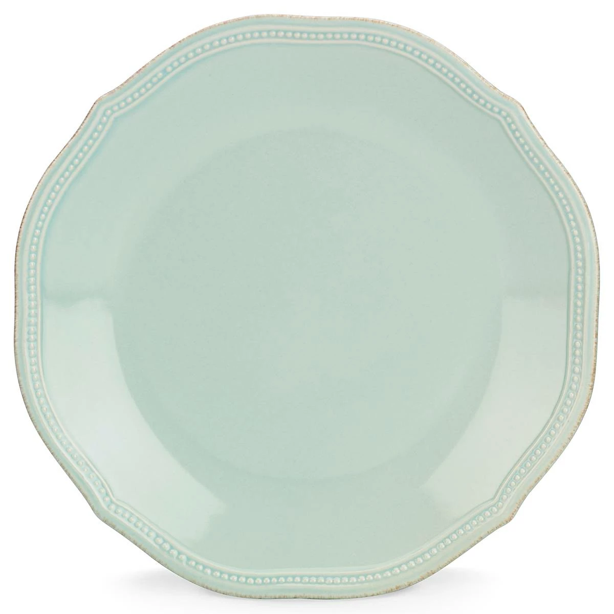 Including an intricate scalloped border, with petite textured raised dots and a hand-applied tea stain finish, this durable ceramic stoneware dinner plate sits on the table in a subtle shade of ice-blue, to bring intrigue to mealtime. This item is microwave and dishwasher-safe, for added convenience.