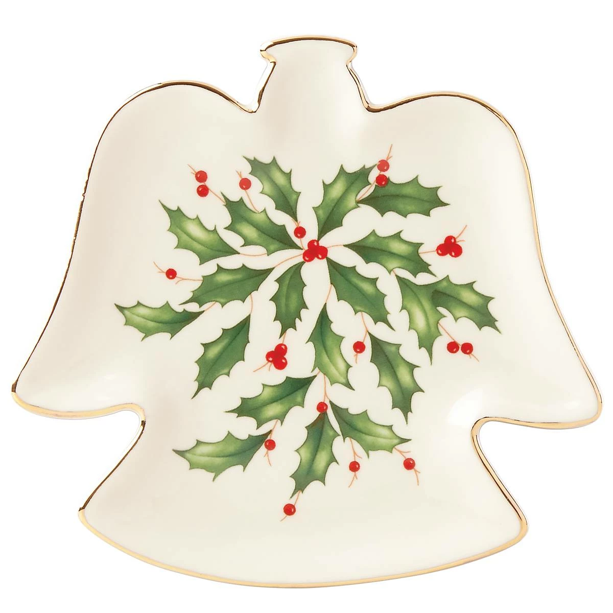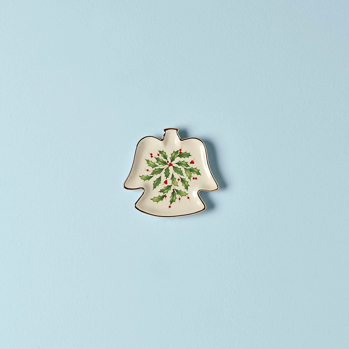Crafted of ivory ceramic, this angel-shaped plate features the classic Lenox holly and berries motif, making it a charming choice for serving holiday candies or mints.