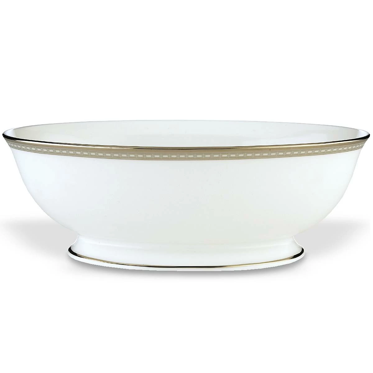 The spacious and elegant Murray Hill Open Vegetable Bowl features a handsome geometric rim of intricate, concentric rectangles and a pristine white surface. This ornate and durable bone china bowl is accented in precious platinum and is dishwasher-safe.