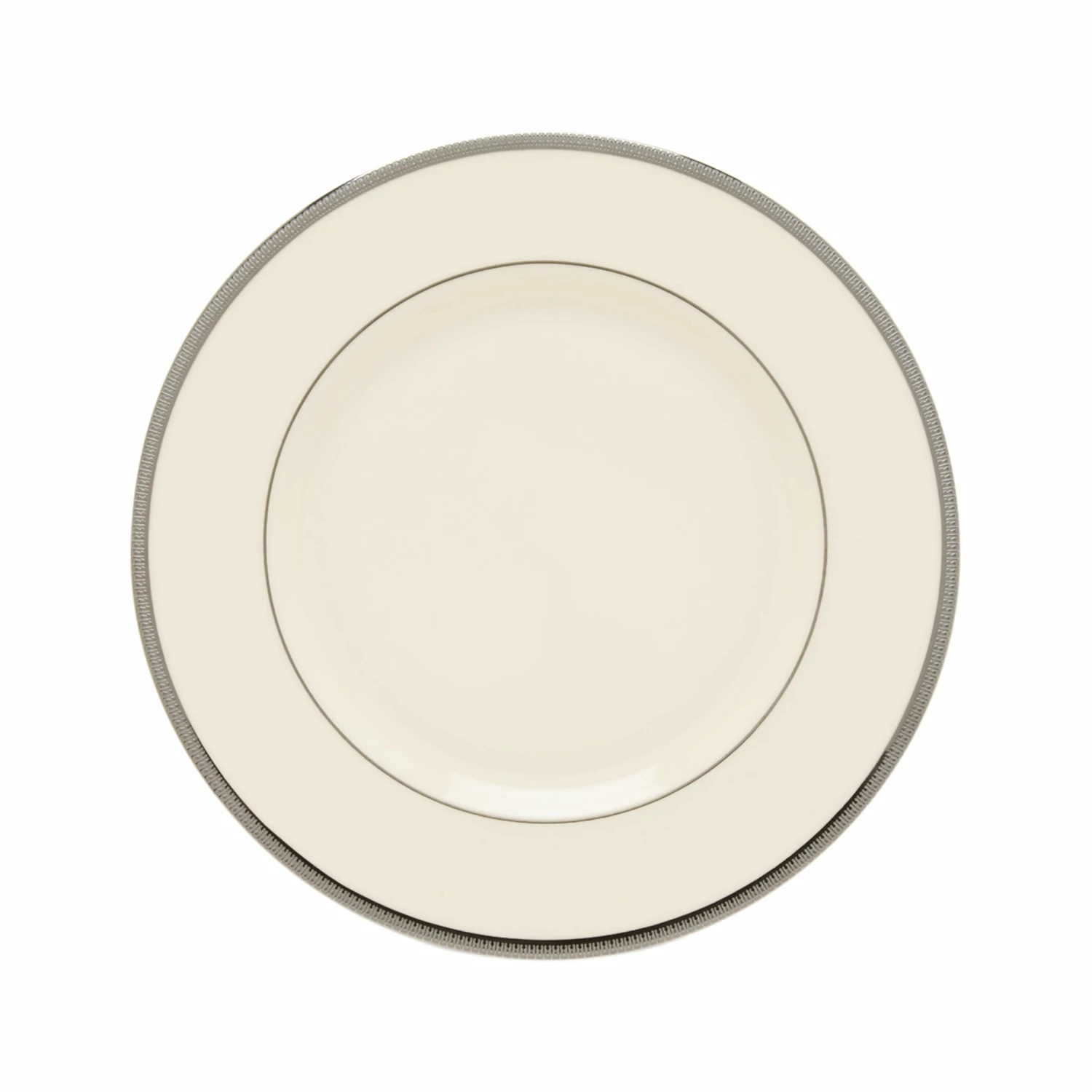 This ivory salad plate, accented with gentle glowing bands of precious platinum, has a classic circular shape and includes a subtle texture along its glittering border, that evokes a wrapped present. Crafted of durable bone china, this item is dishwasher-safe, for added convenience.