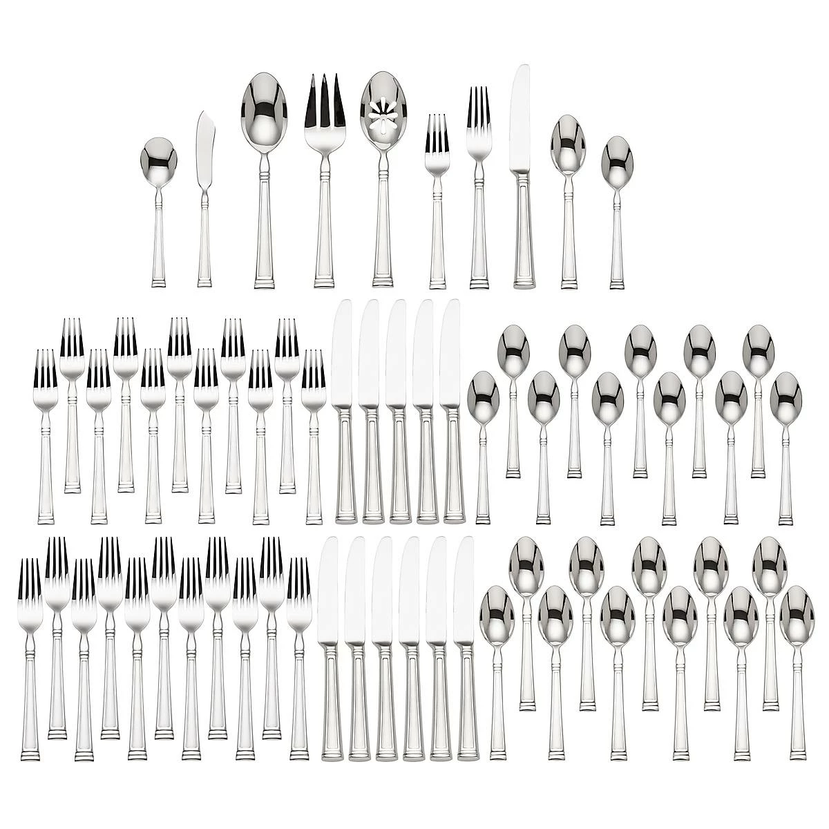 This 65-piece flatware set is a modern, elegant addition to the table, with its subtle ridged edges and tips. Crafted of durable 18/10 stainless steel, this set includes at twelve dinner forks, twelve dinner knives, twelve salad forks, twelve tablespoons, twelve teaspoons, one serving spoon, one serving fork, one pierced serving spoon, one sugar spoon, and one butter knife.