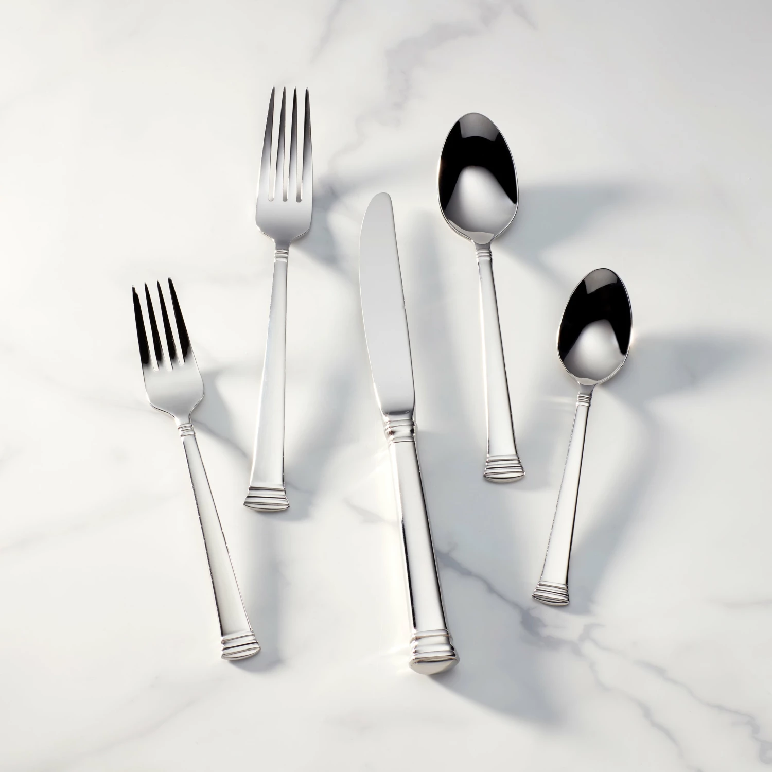 This five-piece 18/10 stainless steel place setting shimmers under the glow of candles at the dinner table with its subtle ridged pattern along the top and bottom of the handles. This set includes a dinner fork, dinner knife, salad fork, tablespoon, and teaspoon.