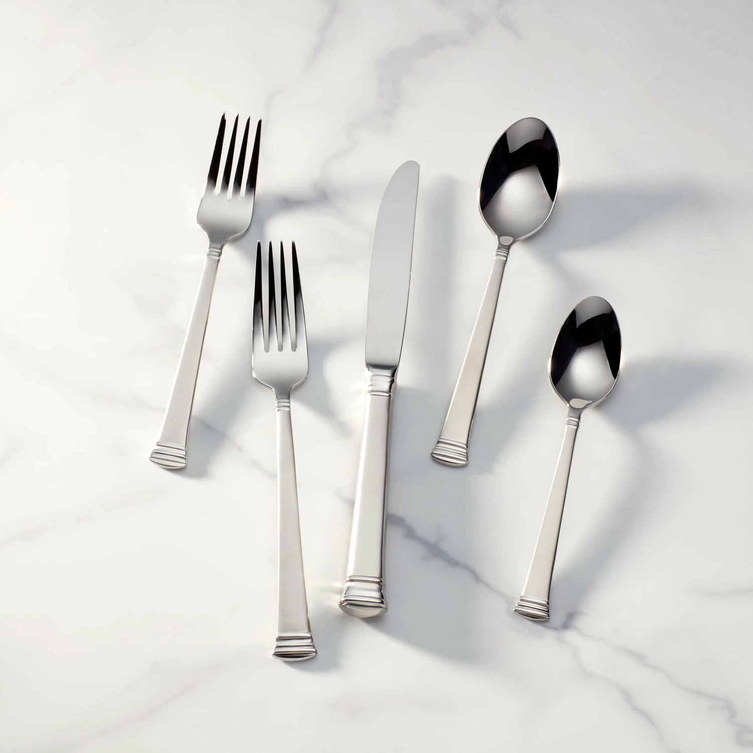 Crafted of durable 18/10 stainless steel, this five-piece place setting has a frosted finish and ridged handles that add texture and a sophisticated, contemporary feel to the set. This set includes a dinner fork, dinner knife, salad fork, tablespoon, and teaspoon.