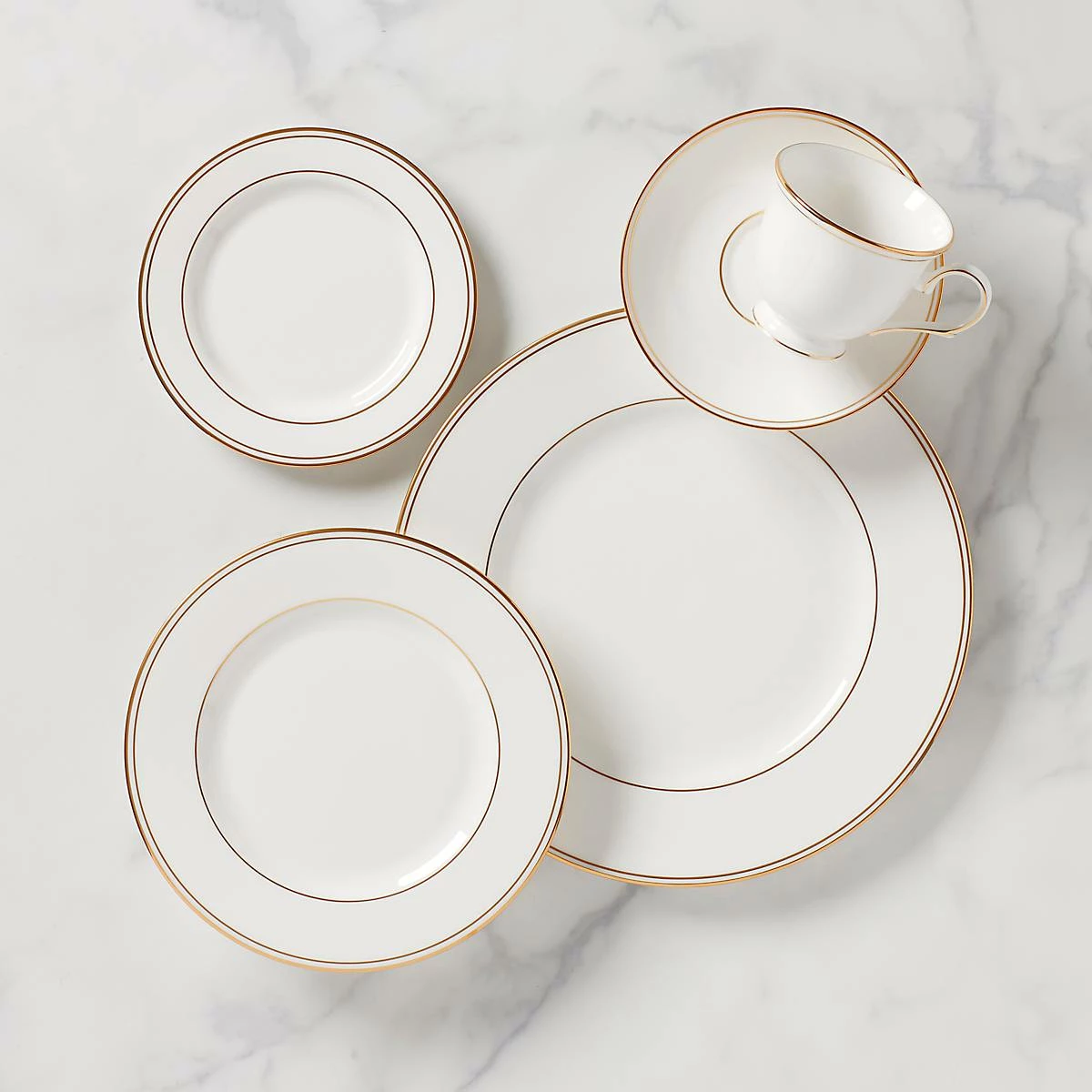 Crafted in durable porcelain and featuring glittering 24-karat gold accents along the rim, this five-piece place setting is a graceful complement to one’s table and includes a dinner plate, salad plate, bread plate and cup and saucer. These items are dishwasher-safe for added convenience