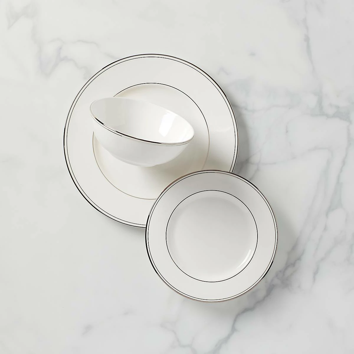 Crafted in durable porcelain and featuring shimmering platinum accents along the rim, this three-piece place setting collection includes a dinner plate, salad plate, and all-purpose bowl. This item is dishwasher-safe, for added convenience.