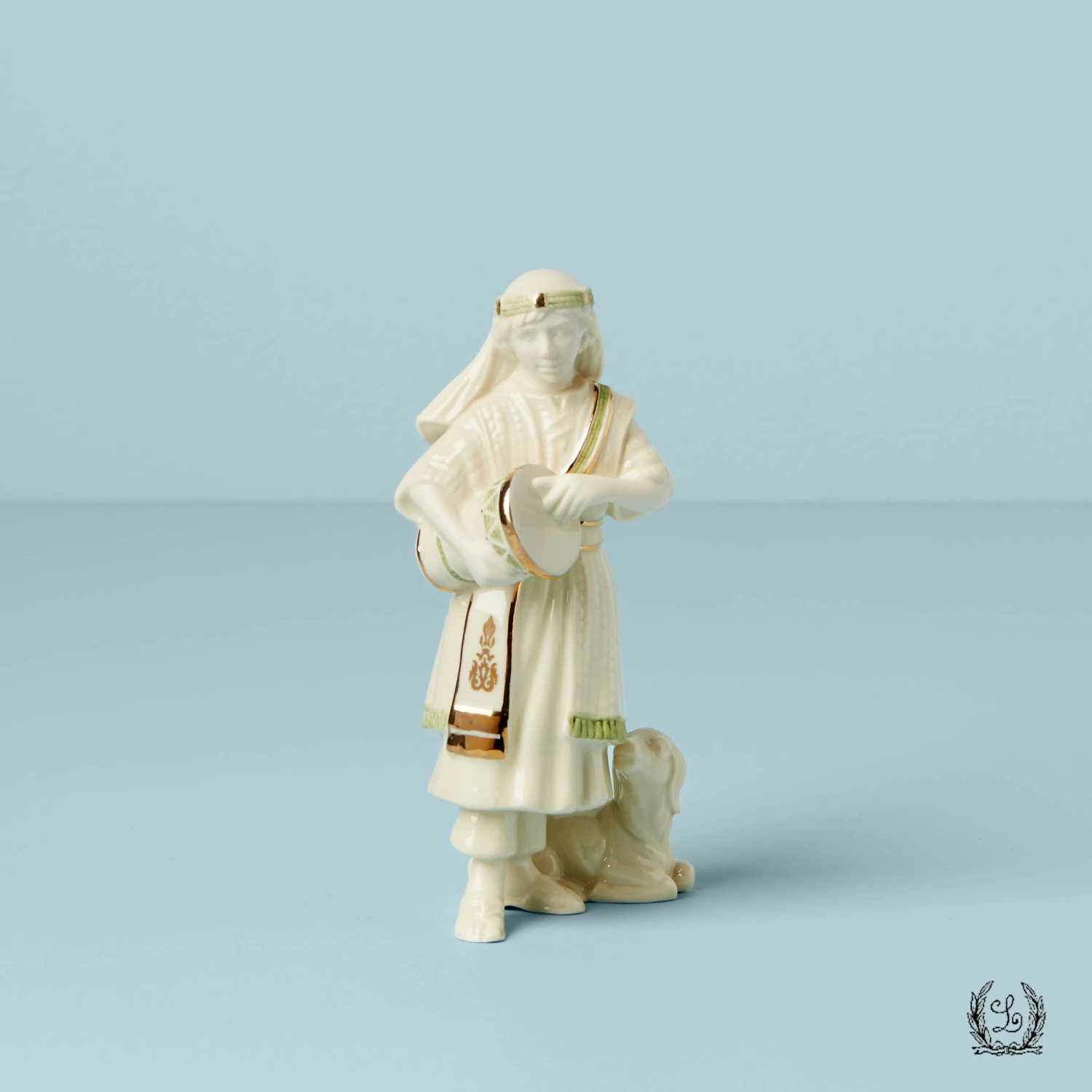 The First Blessing Drummer Boy Figurine is an elegant and compelling addition to a nativity collection. This ceramic figurine features the drummer boy with accents of teal and 24-karat gold. A lamb sits at his feet.