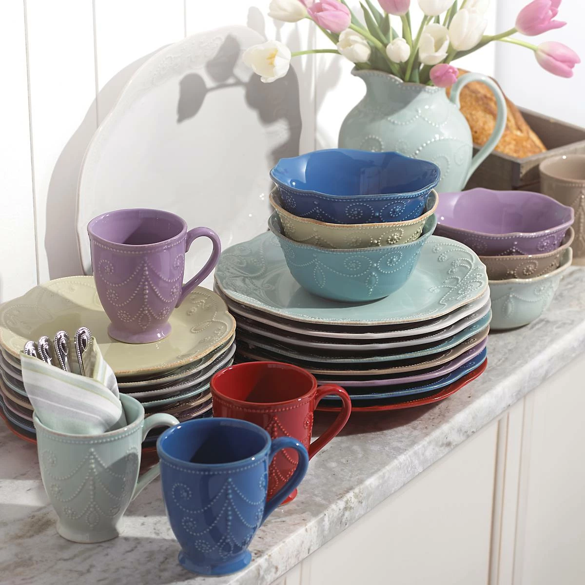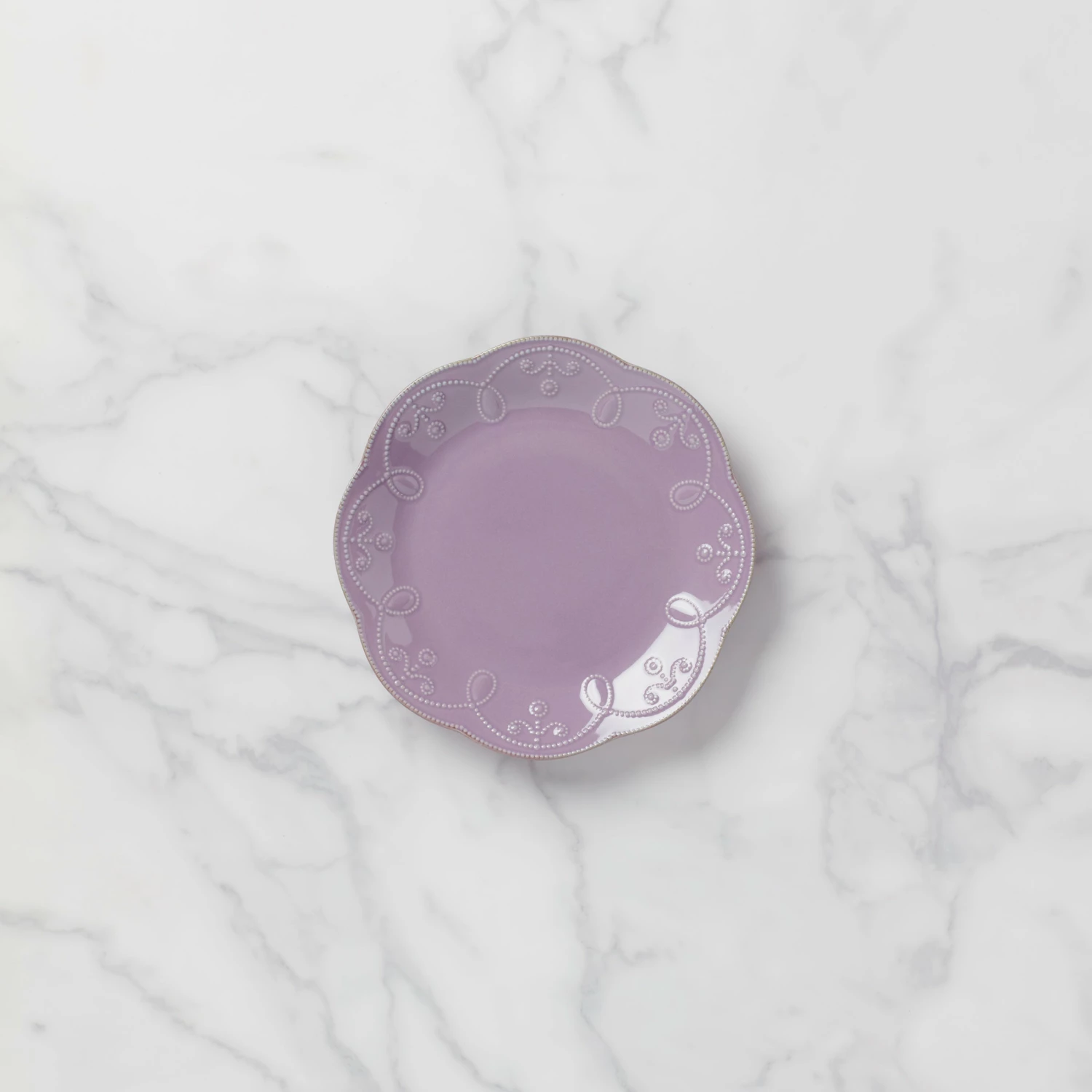 Embellished with swirls and scrolls of beads, this violet accent plate, crafted of durable ceramic stoneware, is a quaint addition to a farmhouse table. Its gentle scalloped border provides a delicate texture, as the hand-applied tea stain border give the piece contrast. This item is microwave and dishwasher-safe, for added convenience.