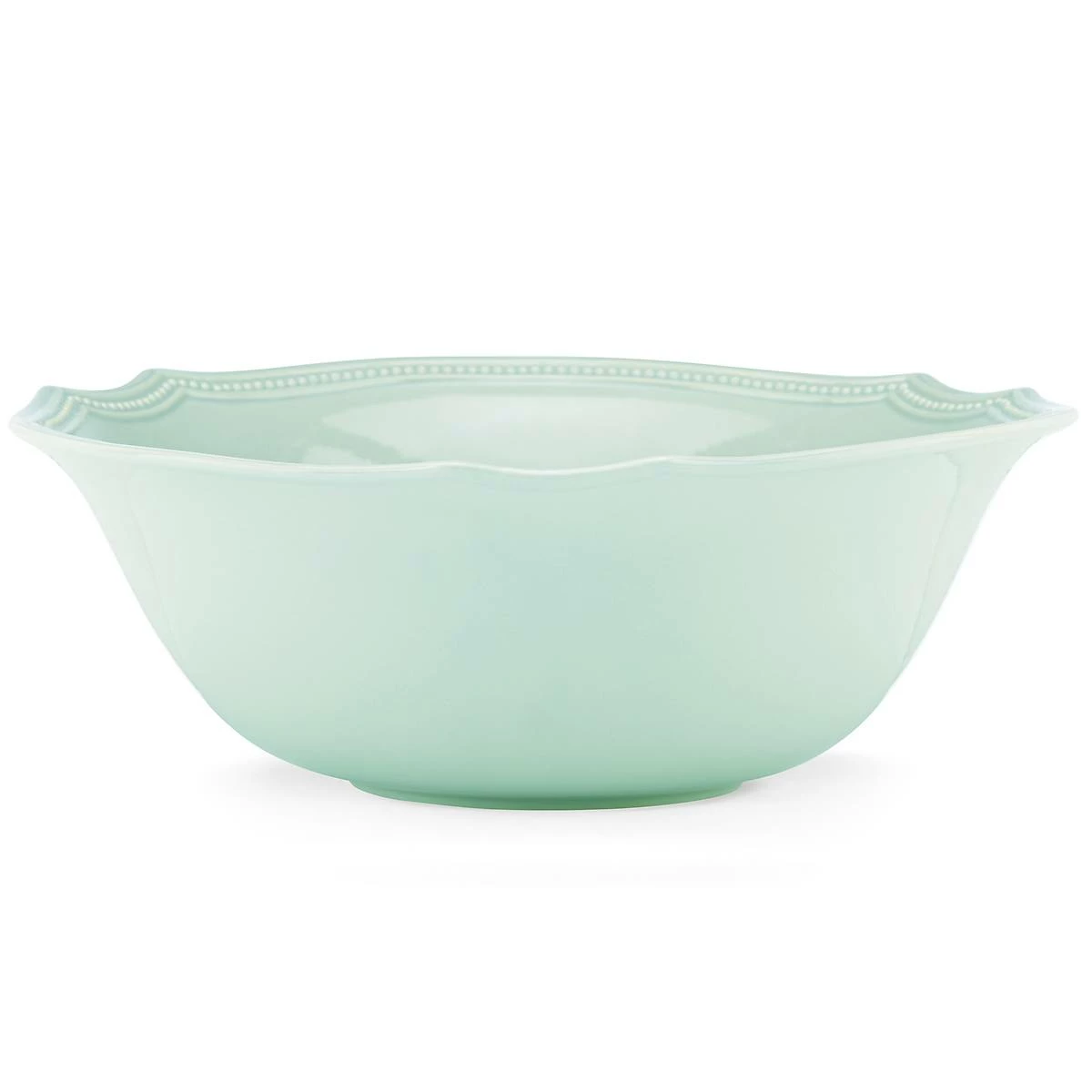 Crafted of durable ceramic stoneware and featuring a delicate border with raised dots, this elegant large serving bowl is a cool ice blue, that evokes the gentle ripples of a lake or pond after a rainstorm. This item is microwave and dishwasher-safe, for added convenience.