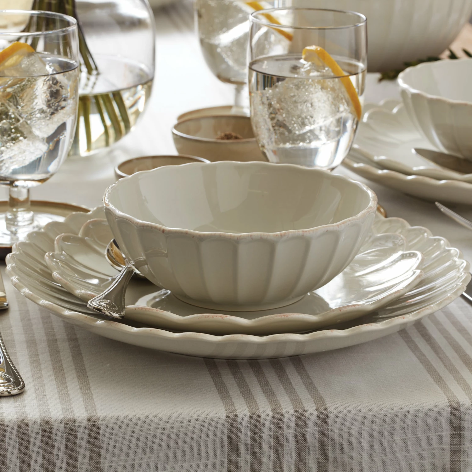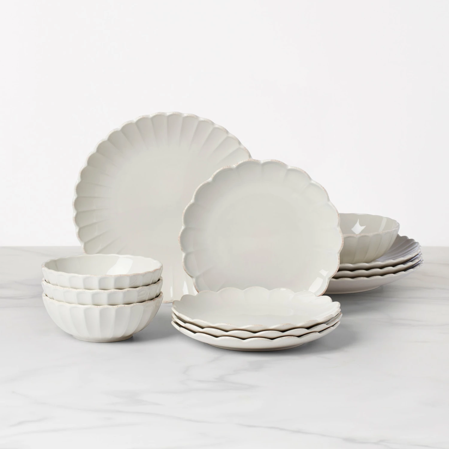 Introducing a fresh and feminine new design to celebrate the 10 year anniversary of French Perle! This 12-piece dinnerware set is a twist on the classic country look with its clean, elegant motif, beautiful ruffles and tea-stained finish. For distinct cafe charm, mix French Perle Scallop with any of our other coordinating collections, like Classic, Groove and Bead. Bon appetit!