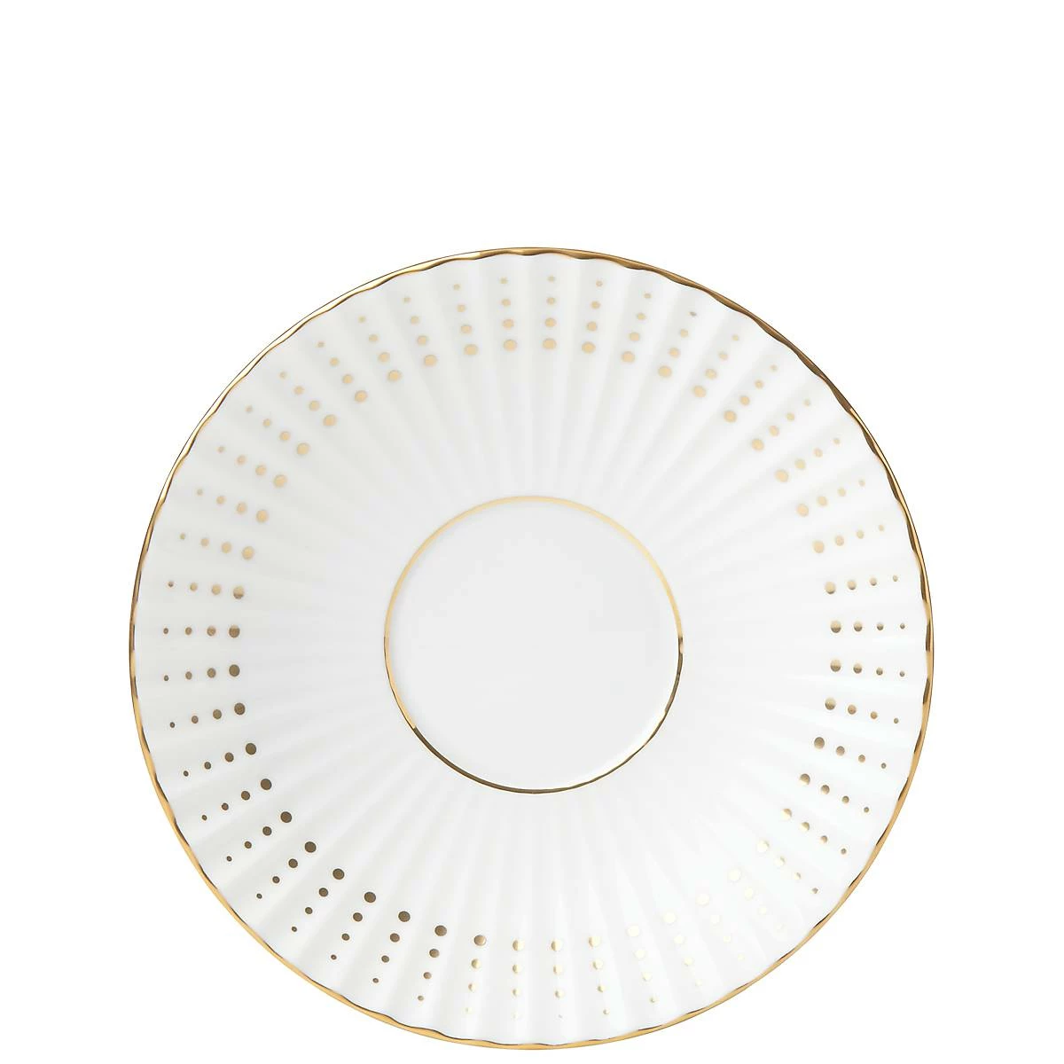 The chic Golden Waterfall Saucer adds texture and shine to casual and formal tea settings. The fluted rim of the saucer features radiating gold dots and a shimmering 24-karat gold trim on durable white bone china. This item is dishwasher-safe, for added convenience.