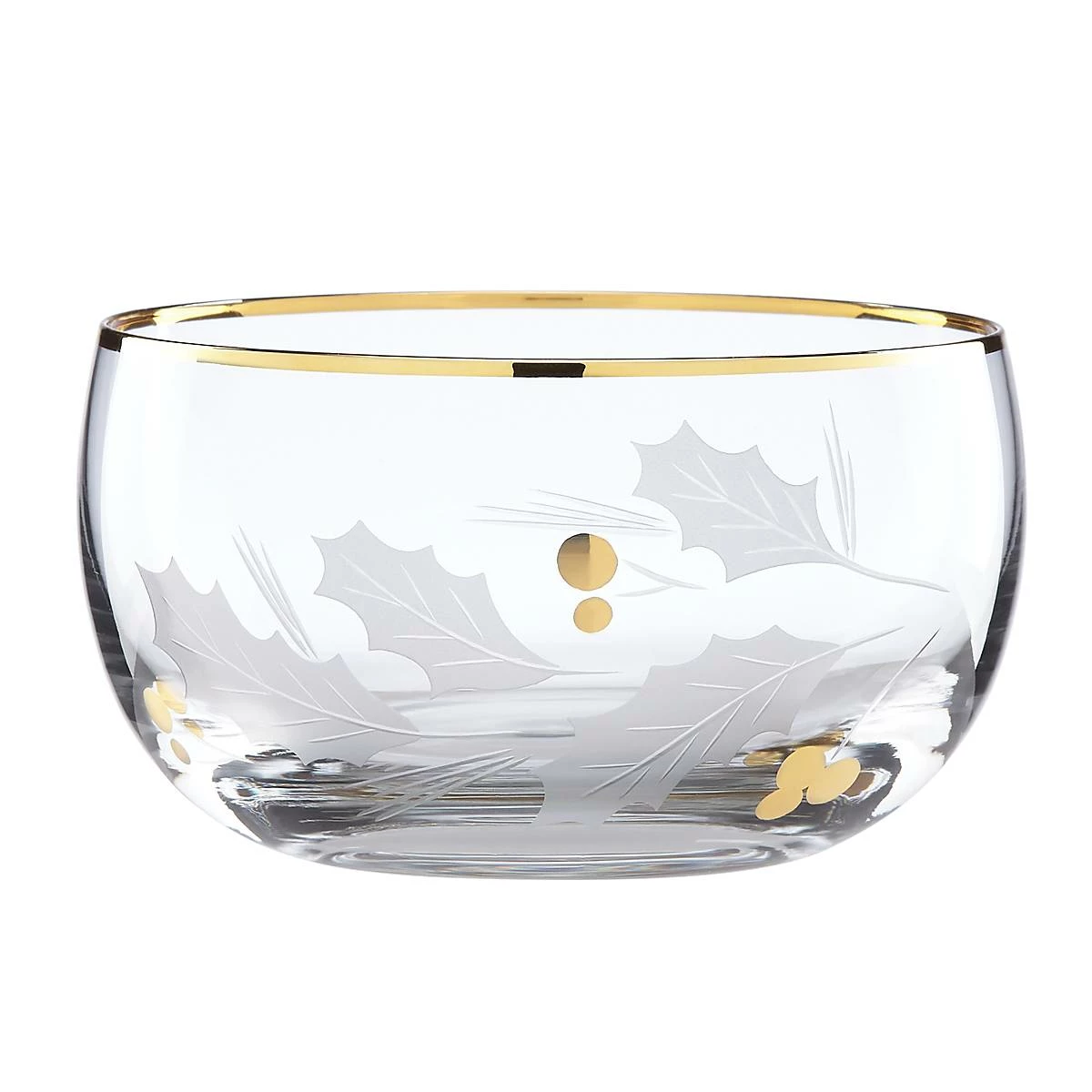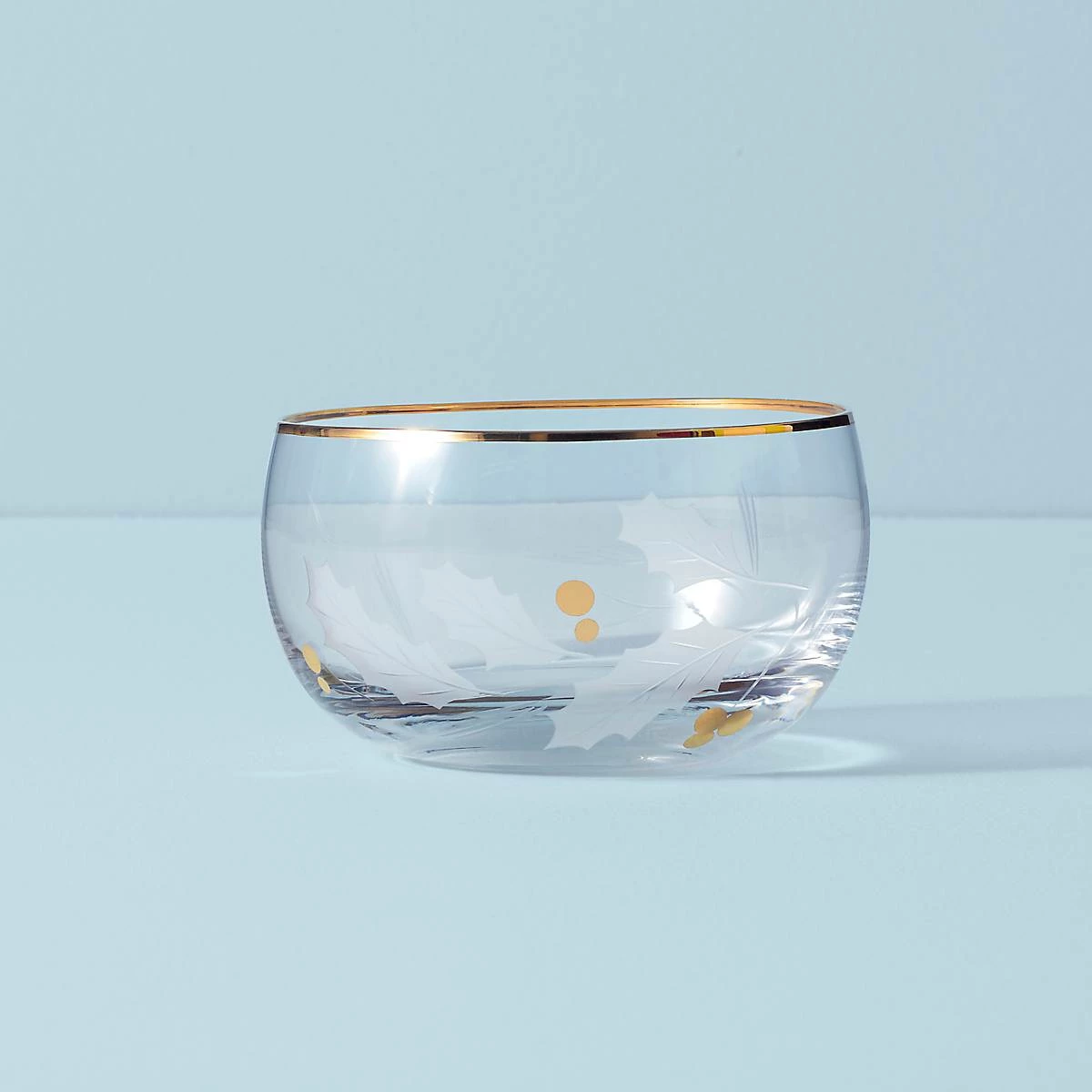 Etched holly leaves with golden berries form an elegant holiday pattern on this glass bowl. A delicate gold finish creates a polished design around the rim.