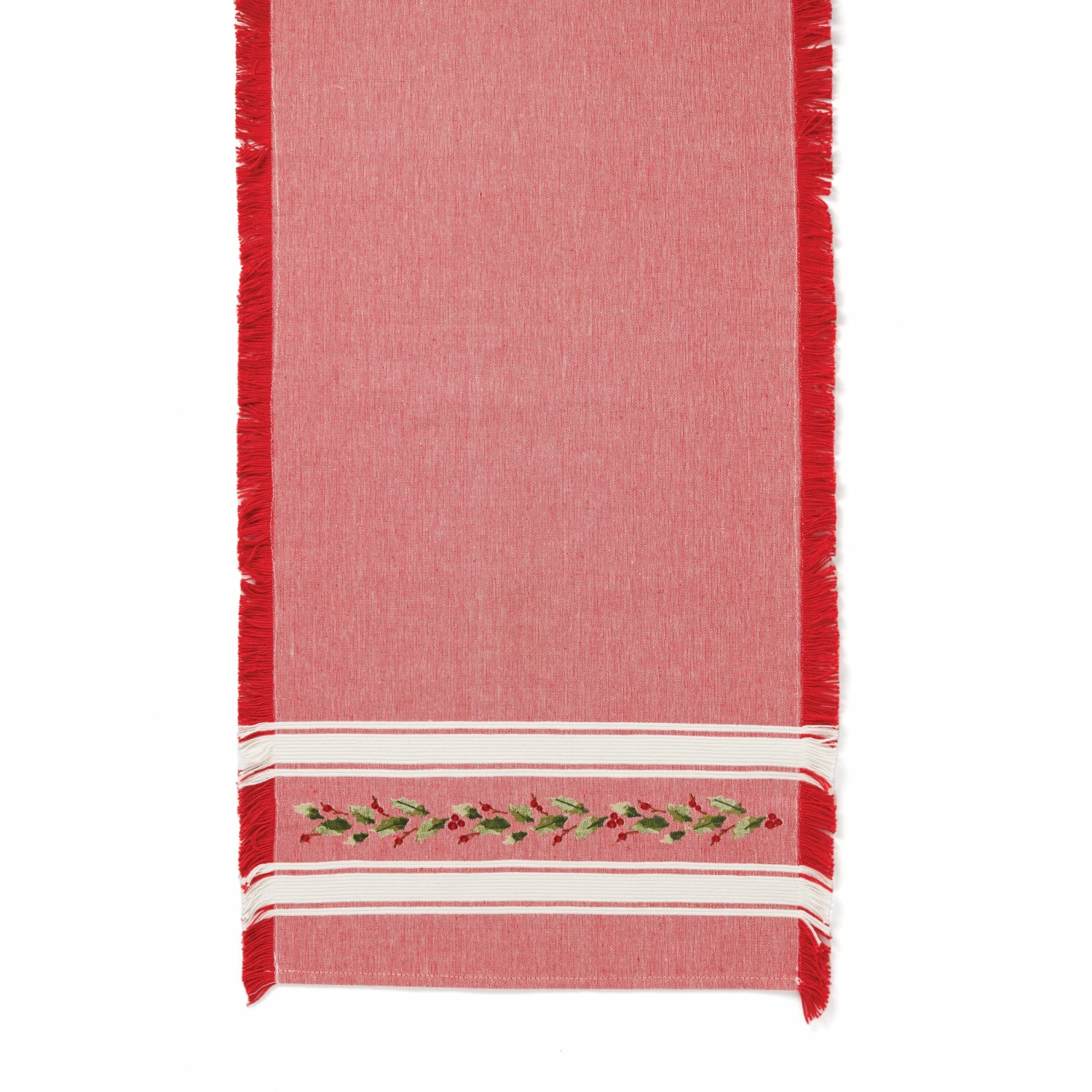 Fresh like a peppermint, our Holiday Handpaint Stripe collection features candy cane stripes in festive reds and whites to create a signature holiday look. This long runner is guaranteed to add merriment to your Christmas table with its holly leaf accent and fringed sides.