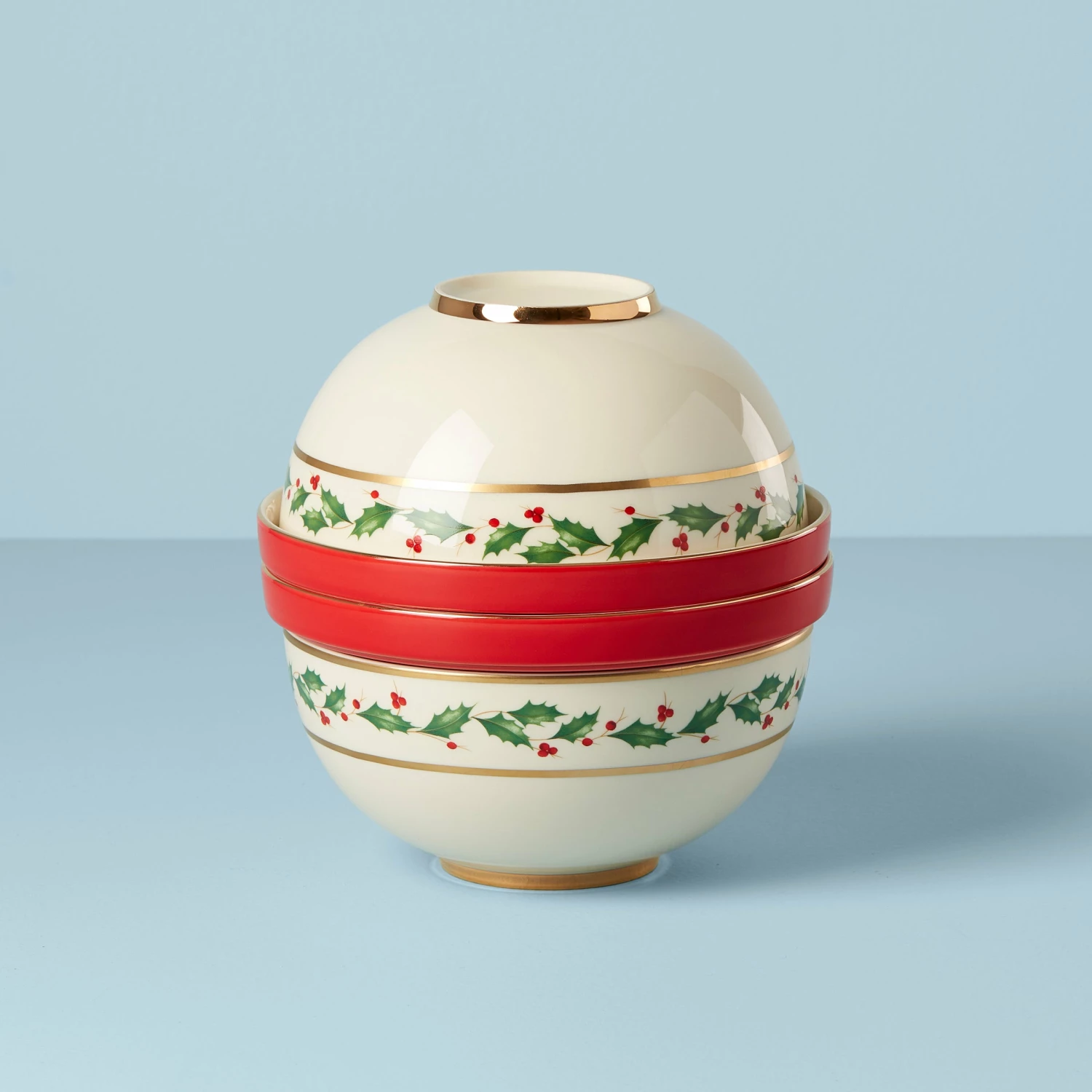 Our popular Luna Nesting Dinnerware Set now comes in our #1 Holiday pattern! It’s crafted of durable, long-lasting porcelain with everyone’s favorite Christmas design of holly leaves, candy cane stripes and luxe golden accents. This all-in-one nesting piece hides six bowls and two plates inside. Take it apart piece by piece to reveal each microwave-and-dishwasher-safe style. Put it all back together and it becomes a compact centerpiece for your table. This timeless set makes a wonderful keepsake you can pass down from generation to generation. Grab yours before it sells out!