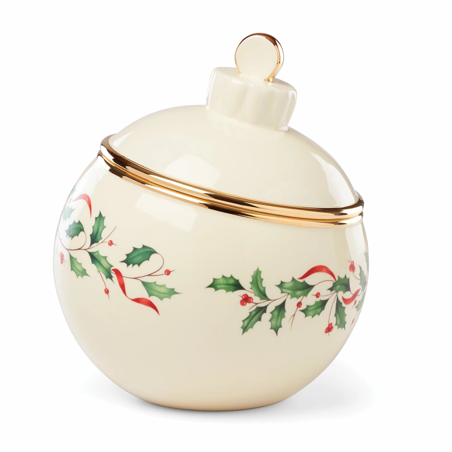 Decorated in our festive holly and berry Holiday motif, this pristine porcelain cookie jar is shaped like a precious Christmas ball ornament with 24k gold accents for a charming finish. Pull off the lid and store cookies, candy and other treats inside!