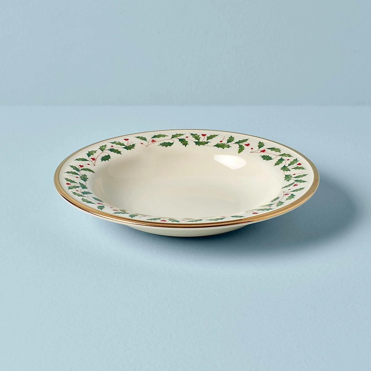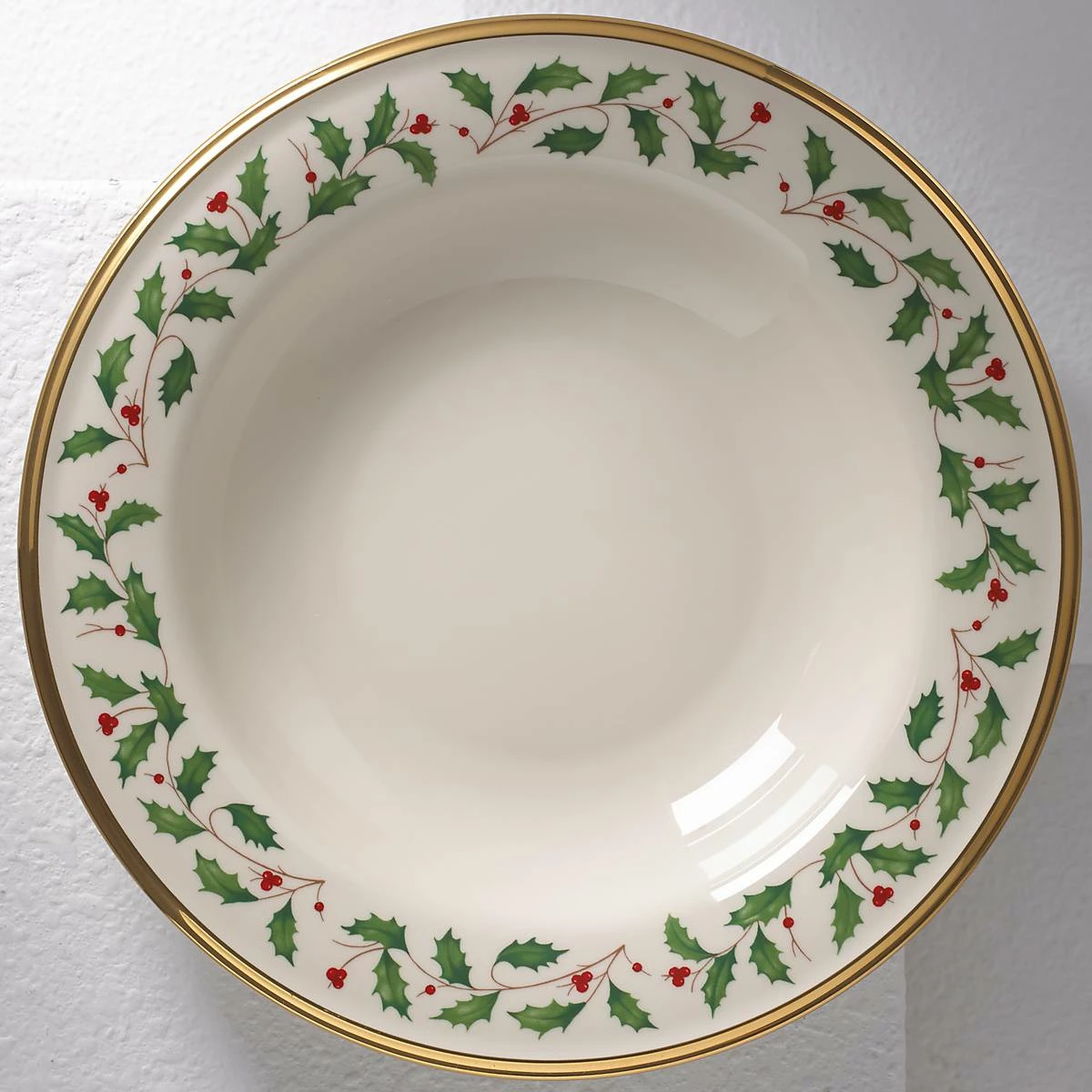 Part of the time-honored Lenox Holiday Dinnerware Collection, our holly and berry motif adorns the surface of the Holiday rimmed pasta bowl. Crafted from porcelain with a rich, 24-karat gold trim for an opulent, holiday-themed tableware addition.