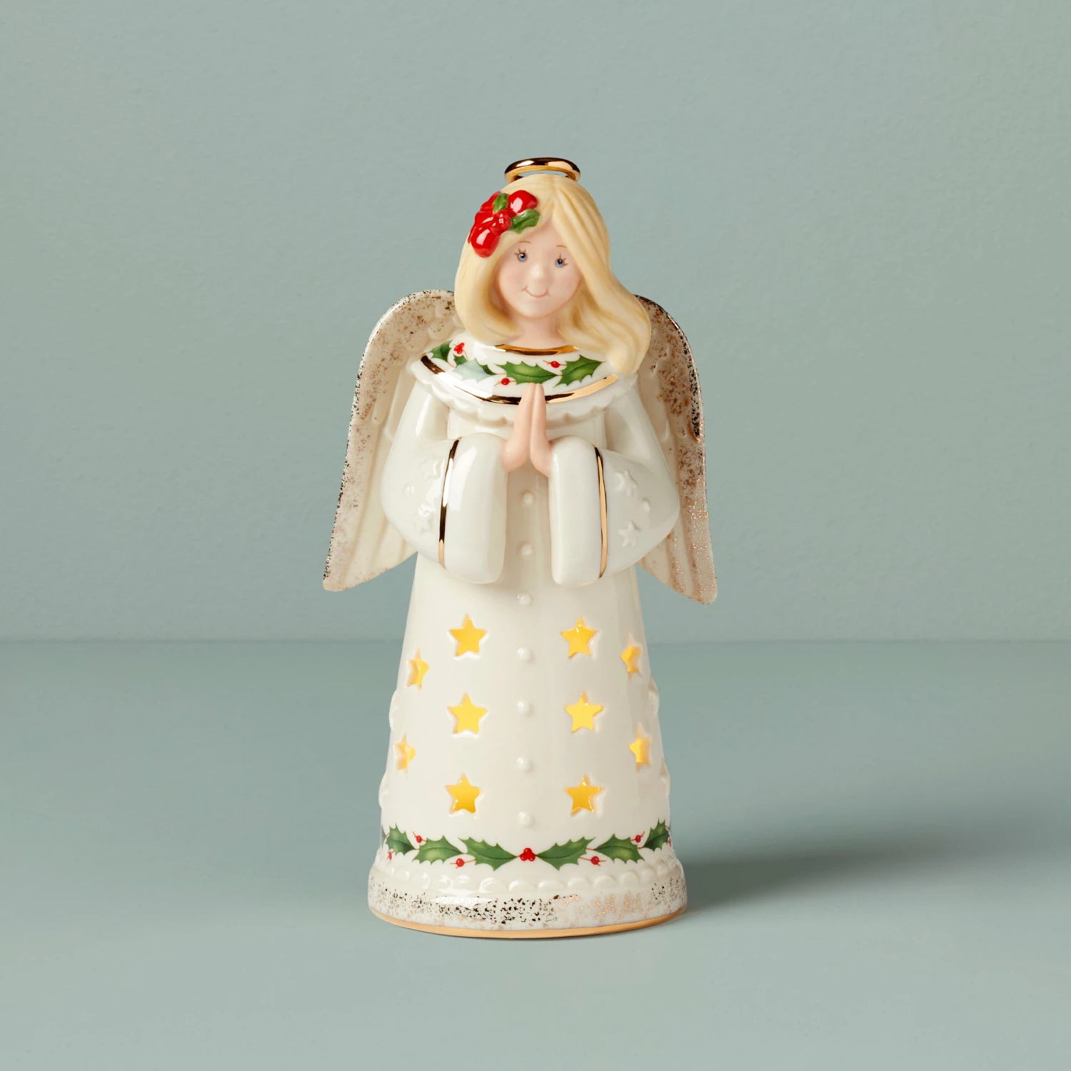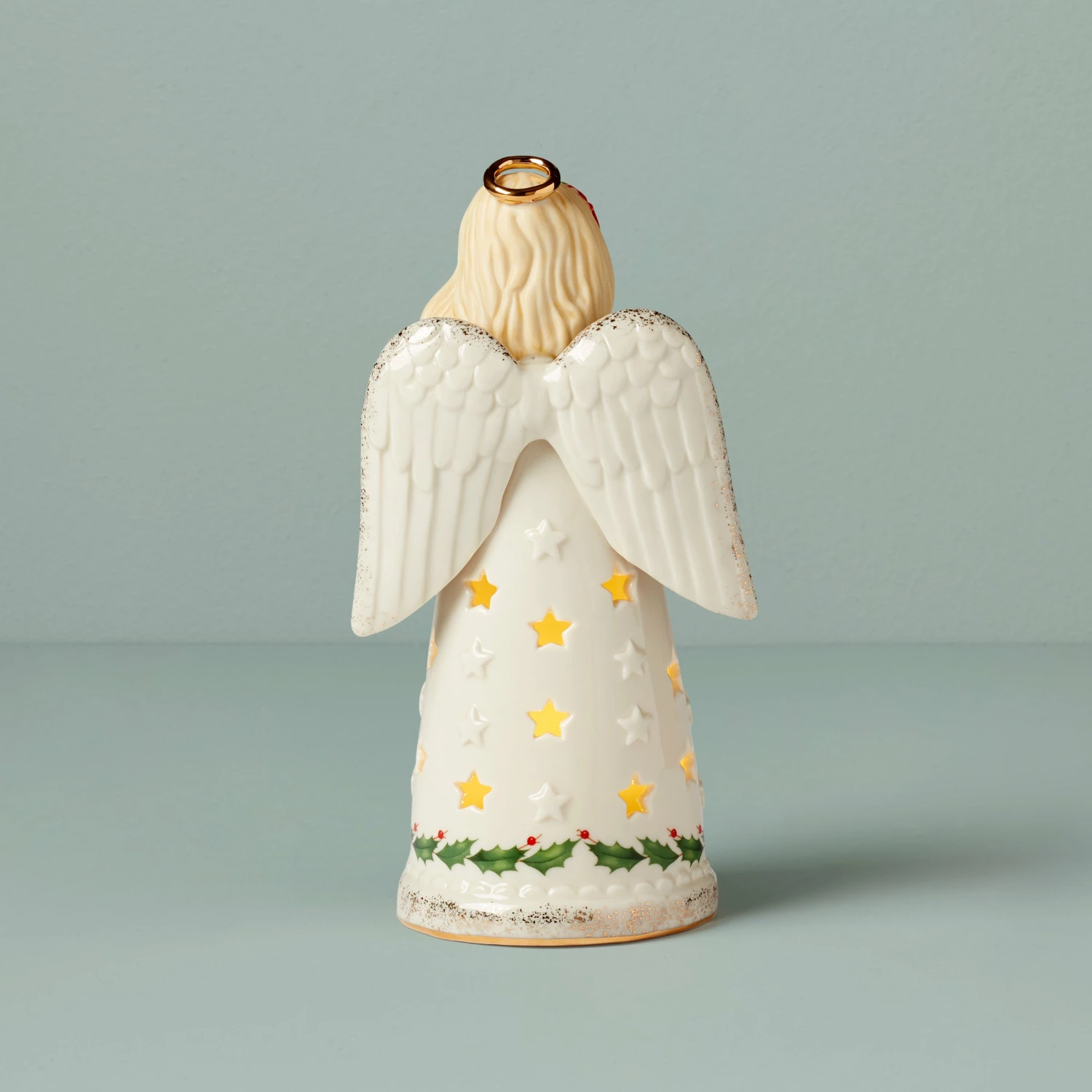 Bring peace and love to your home with this beautifully crafted figurine in ivory porcelain with 24k gold accents. This smiling angel features a sprinkling of glitter with our iconic Holiday pattern motif on her robe. Cut-out stars let the light illuminate from the inside for a gorgeous glow that adds warmth to your mantel.