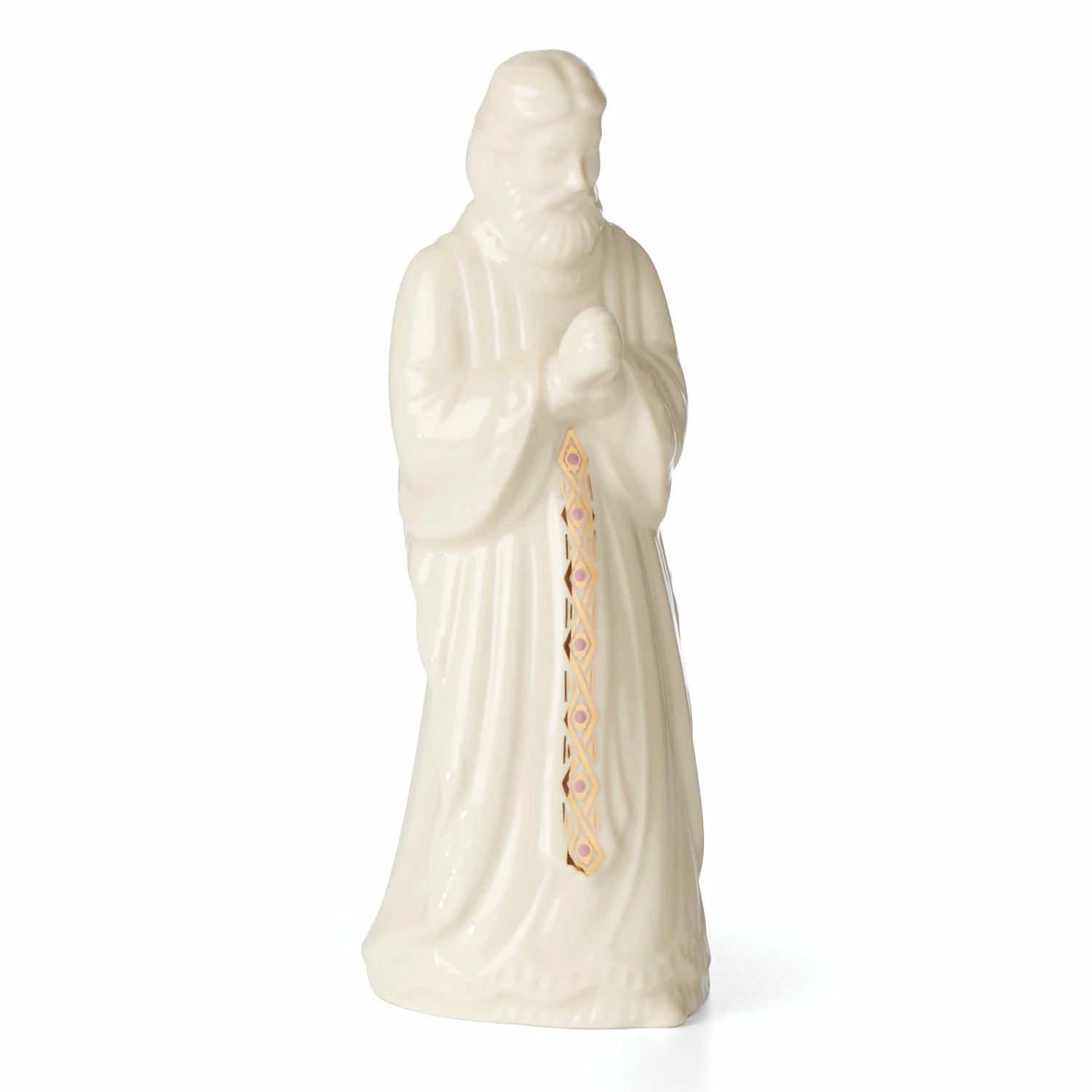 This fatherly figurine of Joseph is the perfect addition to your nativity scene. Crafted with a flawless white robe with glistening gold designs.