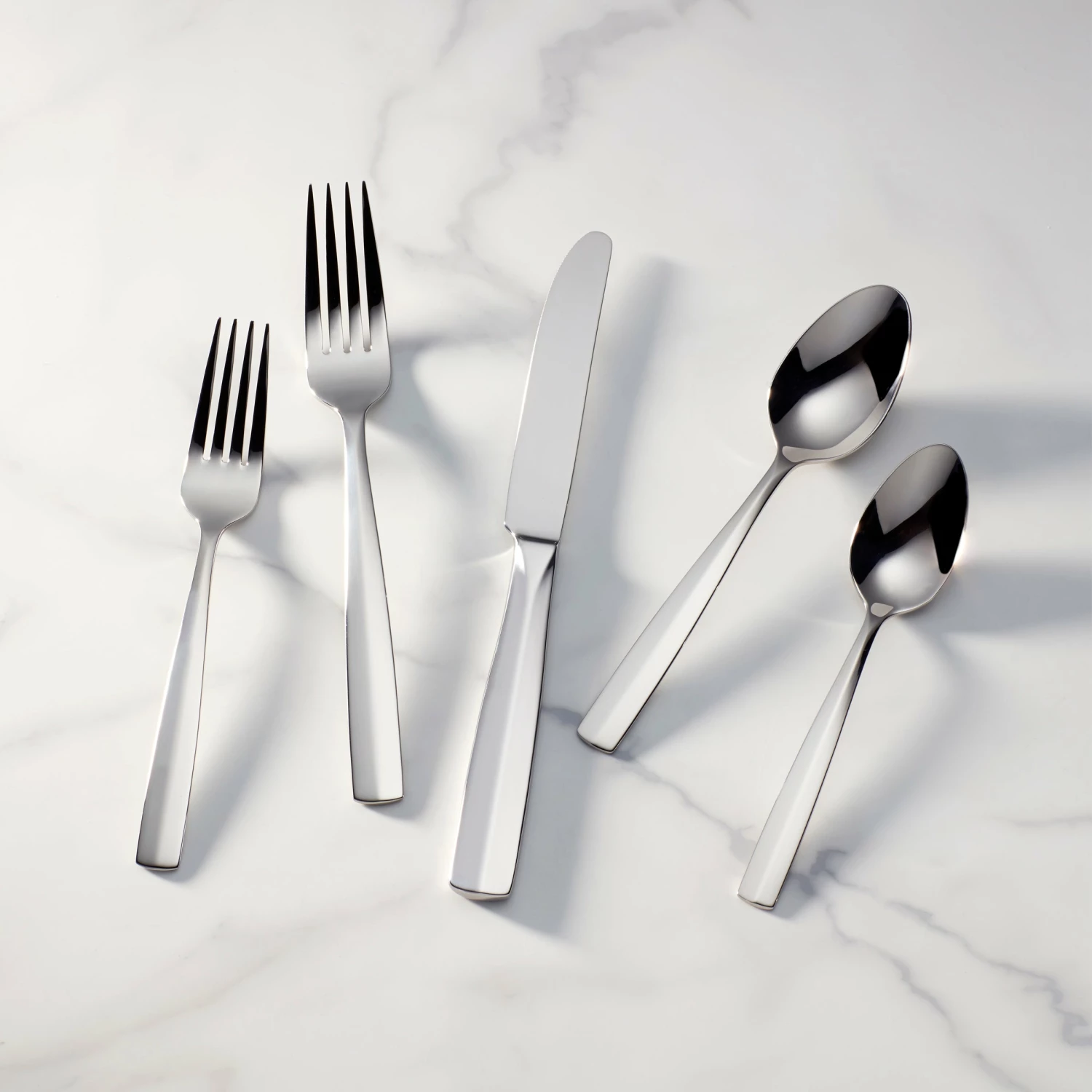 The Lachlan 65-piece Flatware Set features a subtle ridge accenting the center of each squared handle. Crafted of durable 18/10 stainless steel, this set includes at twelve dinner forks, twelve dinner knives, twelve salad forks, twelve tablespoons, twelve teaspoons, one serving spoon, one serving fork, one pierced serving spoon, one sugar spoon, and one butter knife.