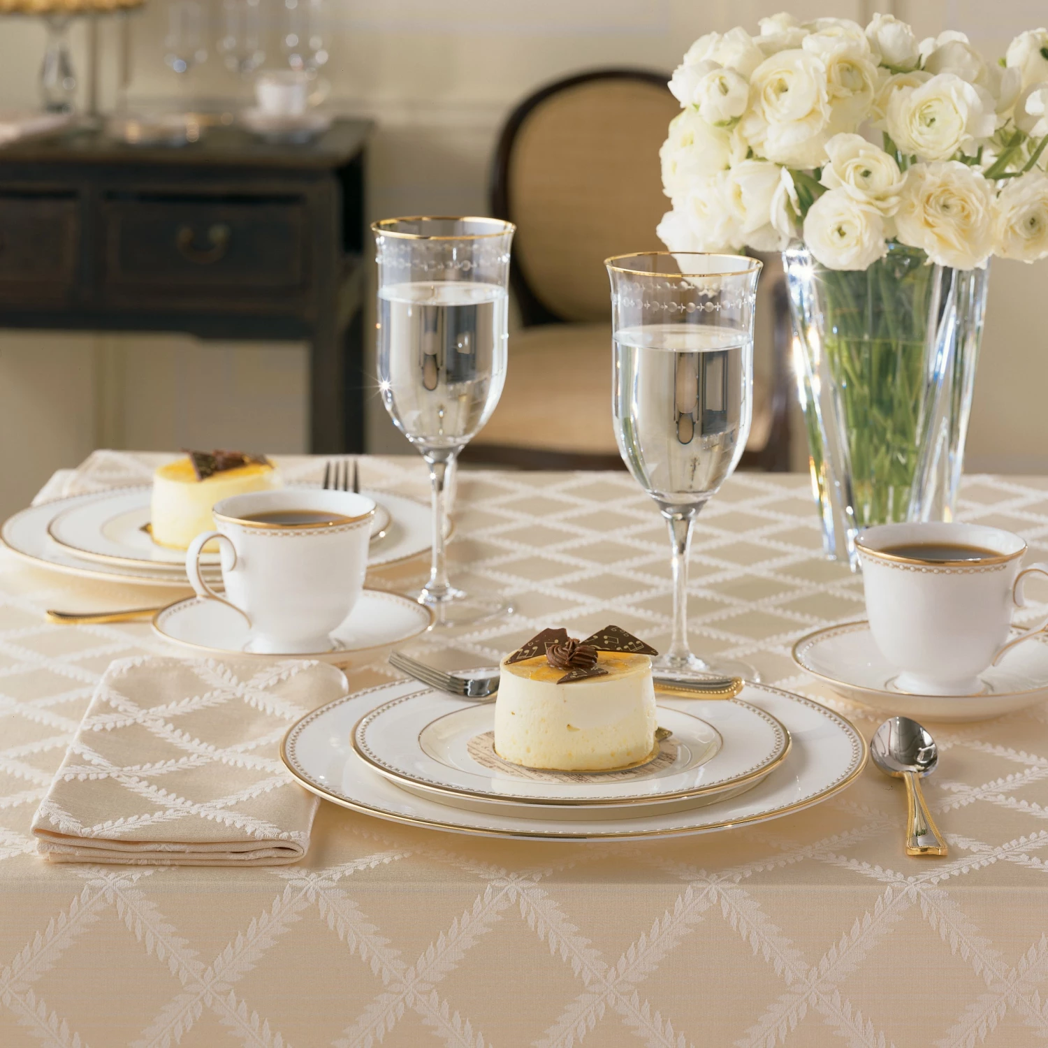 Create an elegant look on your table with this gorgeous ivory tablecloth. A refined laurel leaf pattern in overlapping diamonds brings a distinguished display for every meal.