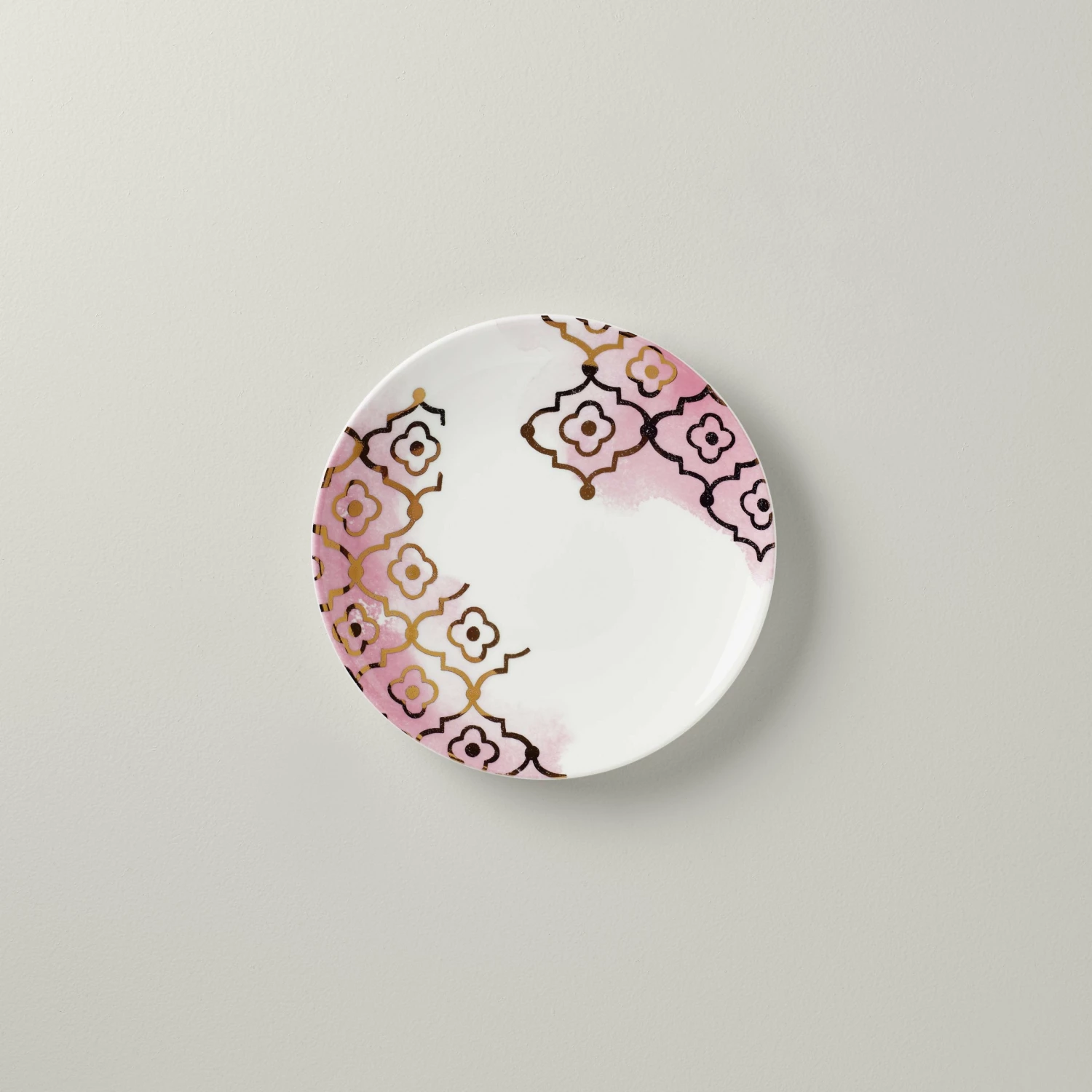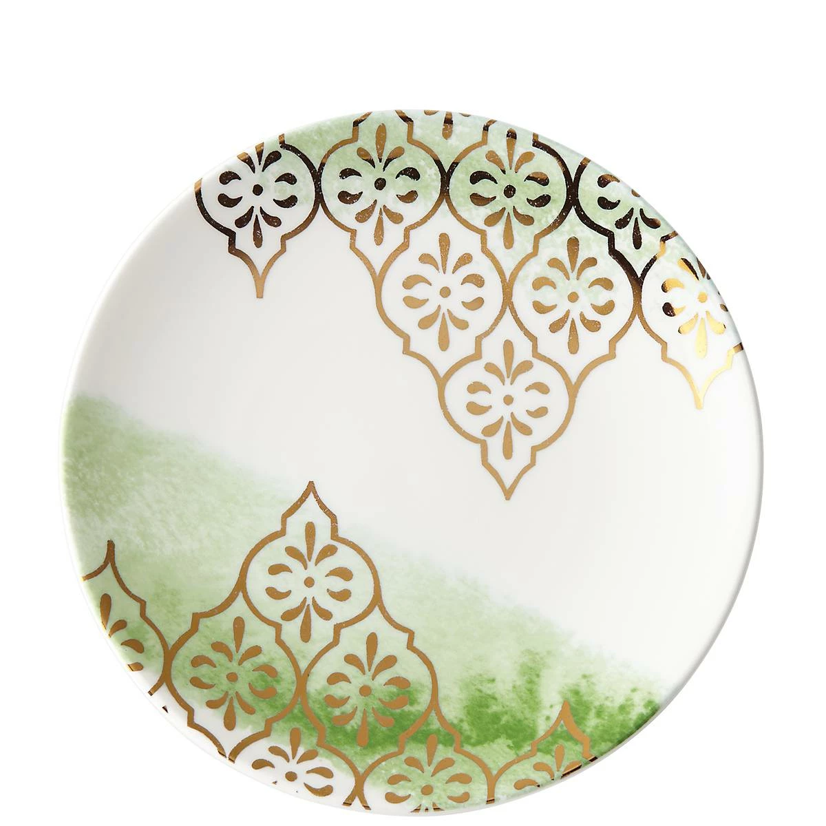 Crafted with microwave-safe gold, the coupe-shaped Mosaic Radiance Green Watercolor Accent Plate features earthy green watercolors and Mediterranean geometric patterns. This rustic and durable bone china plate has a gleaming glossy finish, and is microwave and dishwasher-safe. Available exclusively at Bloomingdale’s and Lenox.com.