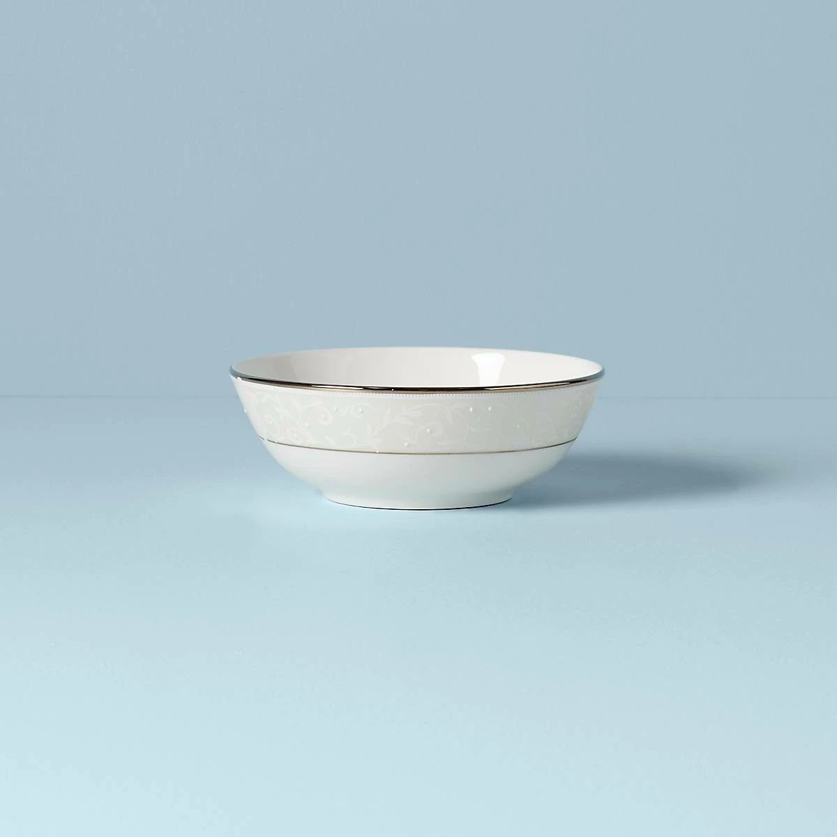 Elegant and versatile, the Opal Innocence Blue Place Setting Bowl features a soft blue motif of scrolling dots. This ornate and durable bone china bowl is dishwasher-safe, and is accented in precious platinum.