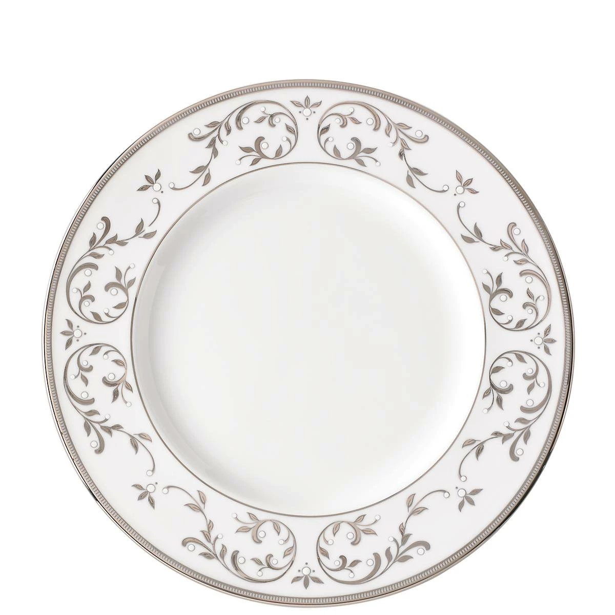 The pristine and extravagant Opal Innocence Silver Platinum 9″ Accent Plate features a faultless white surface and a delicate silver motif of raised dots. This ornate and durable bone china accent plate is accented in precious platinum, and is dishwasher-safe for added convenience.