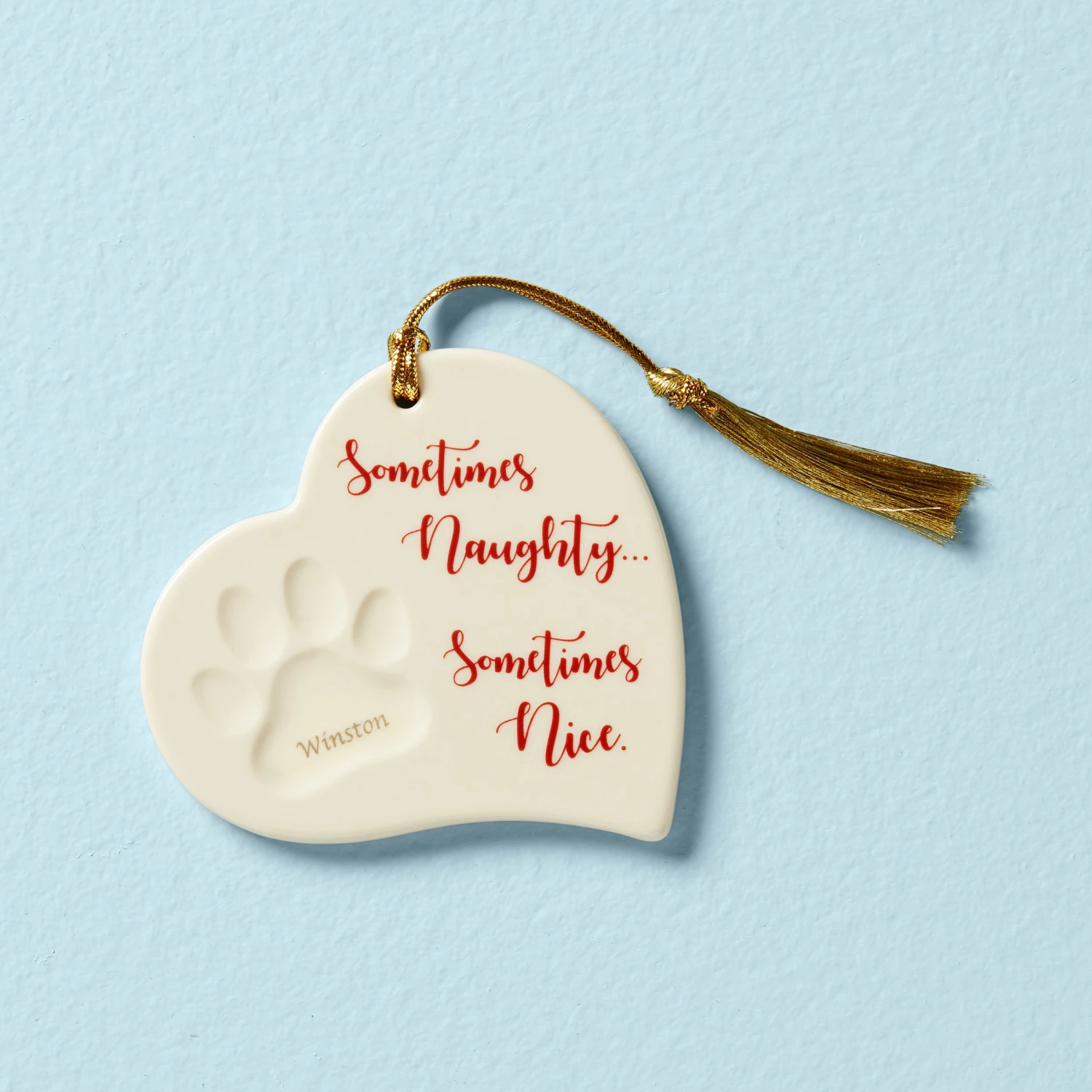 This ornament says it all: “Sometimes Naughty… Sometimes Nice.” But we love our pets anyway! Celebrate your favorite furry friend with this sweet heart-shaped ornament. In the center of the pawprint is a space that is smooth and flat for personalization.